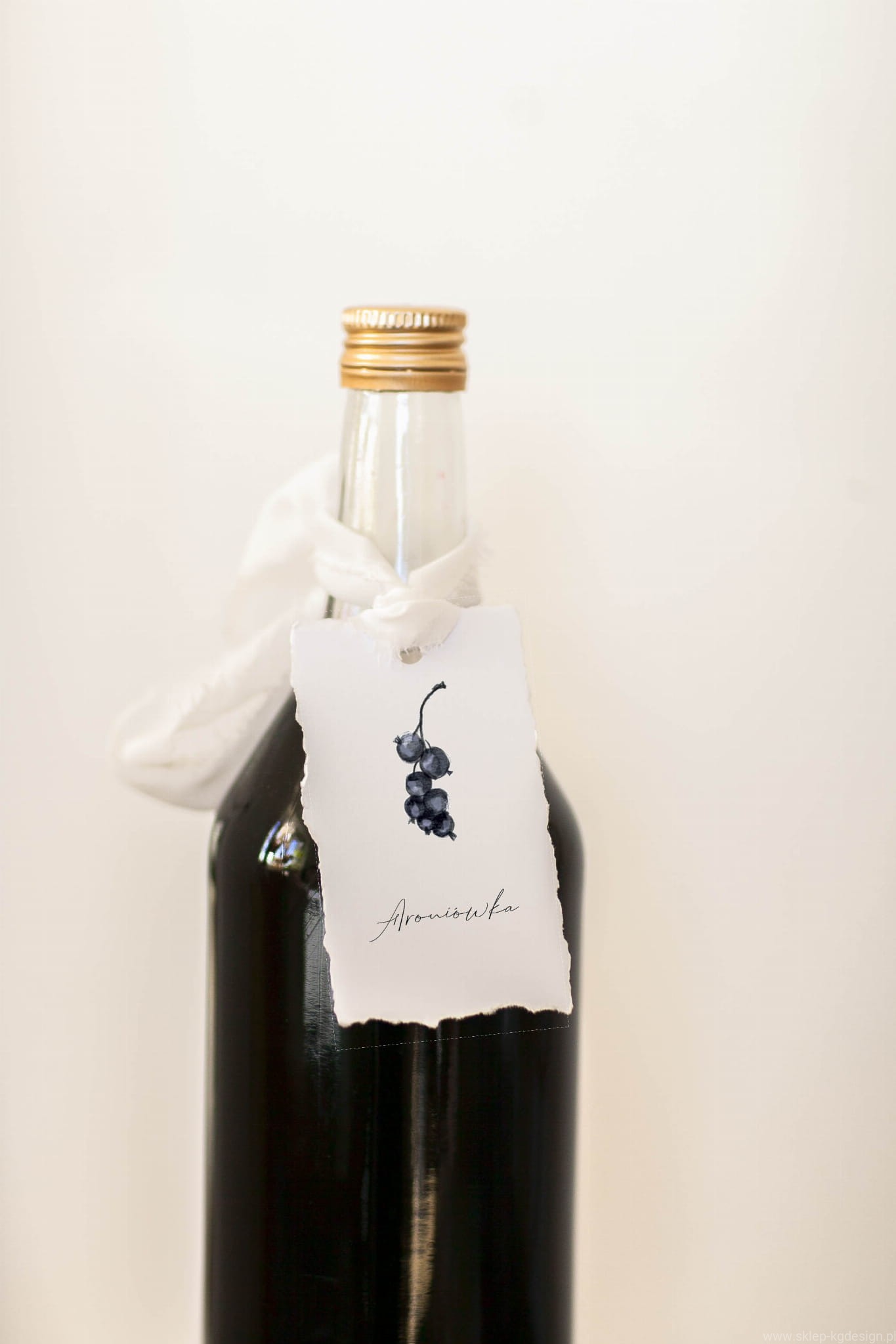 Zawieszka na nalewkę z aronii w stylu boho drukowana na białym, targanym papierze z rwanymi brzegami i z nadrukowaną grafiką owocu.