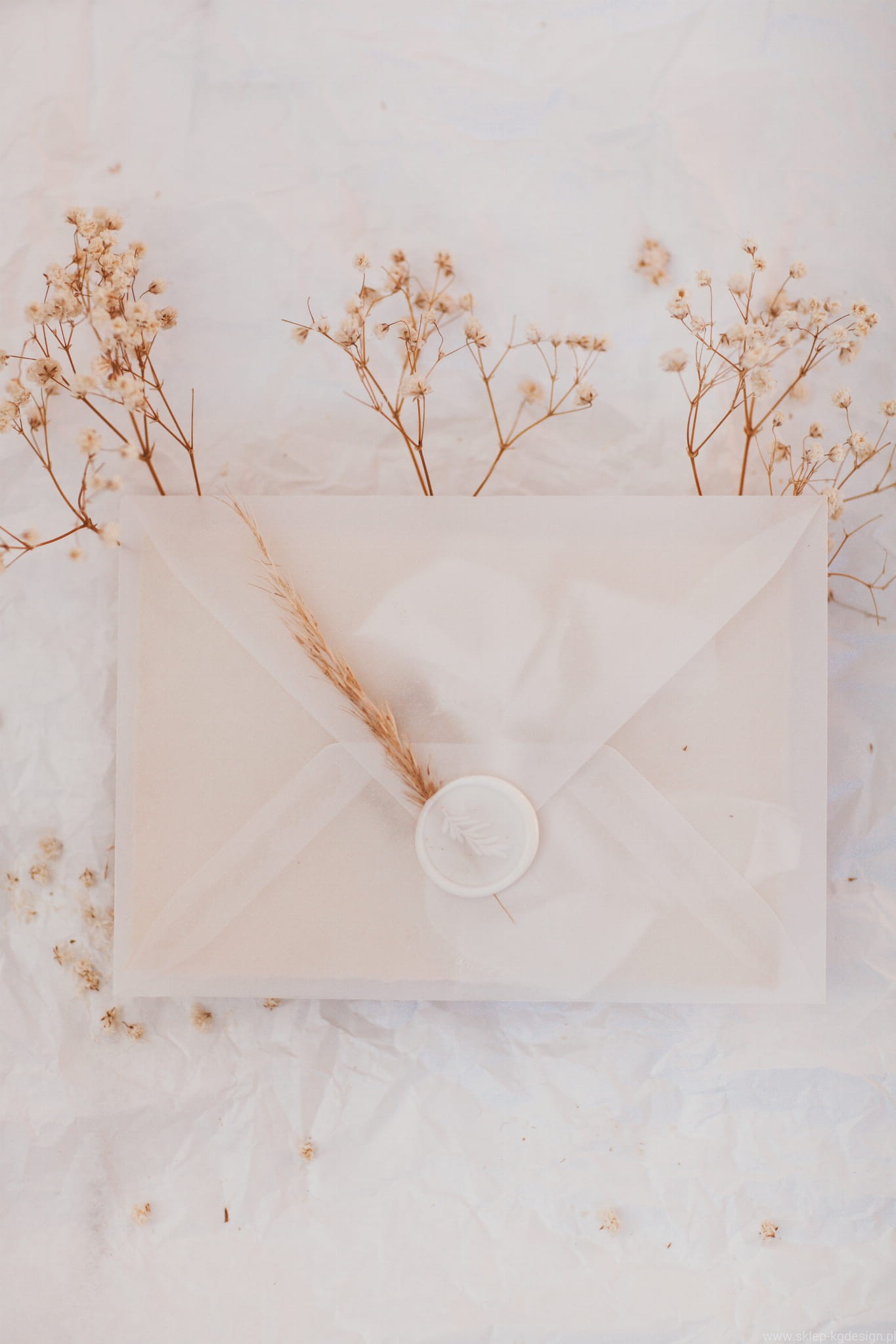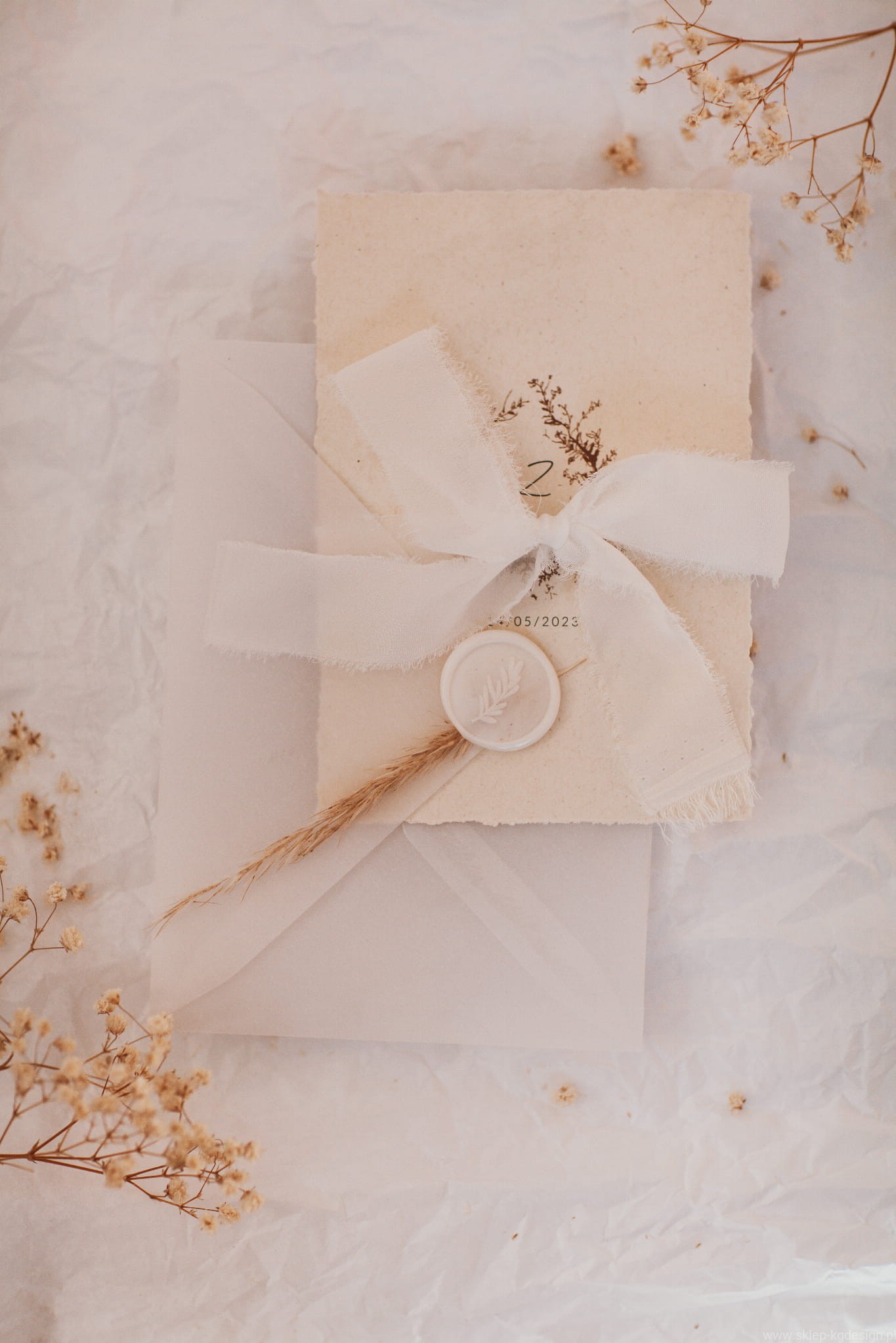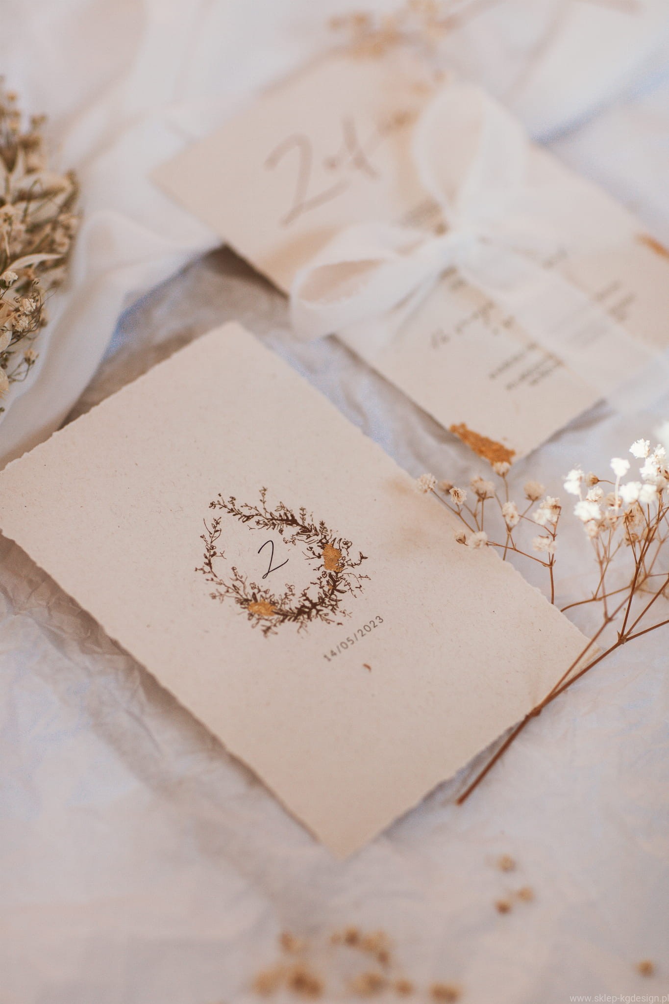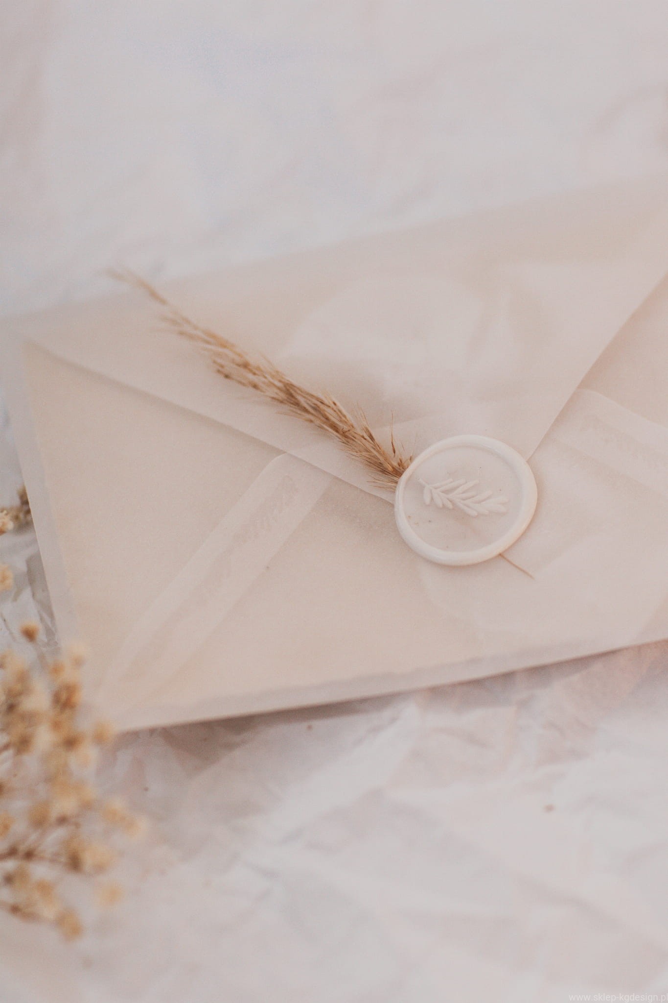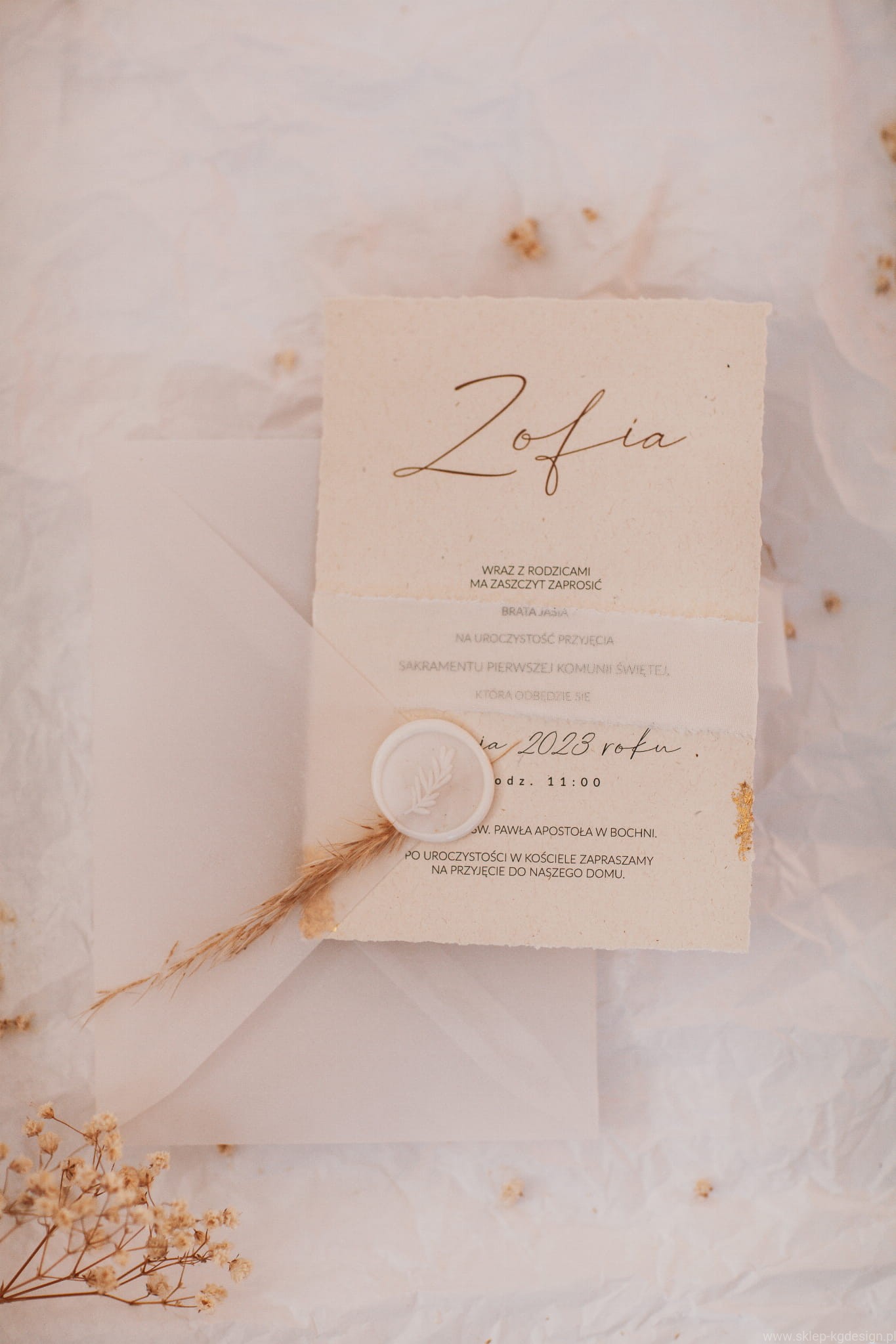 Zaproszenia są drukowane na papierze kremowym, ekologicznym z wtrąceniami. Na kartach jest nanoszone ręcznie delikatne złocenie. Dodatkowo lekkości dodaje materiałowa wstążka oraz transparentna koperta ze stempelkiem lakowym w kolorze białym.