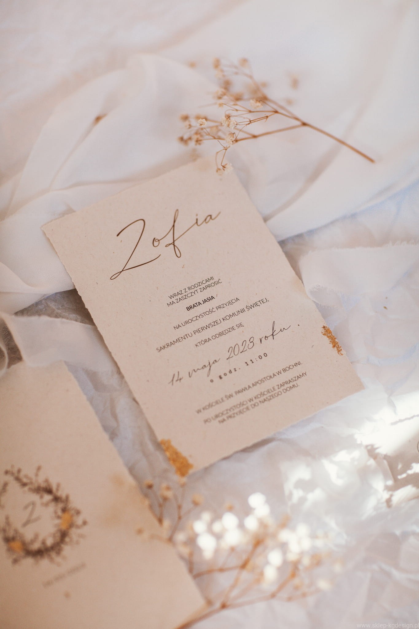 - zaproszenie ok 11x16cm, karta główna na papierze eco, druk dwustronny z delikatnymi złoceniami