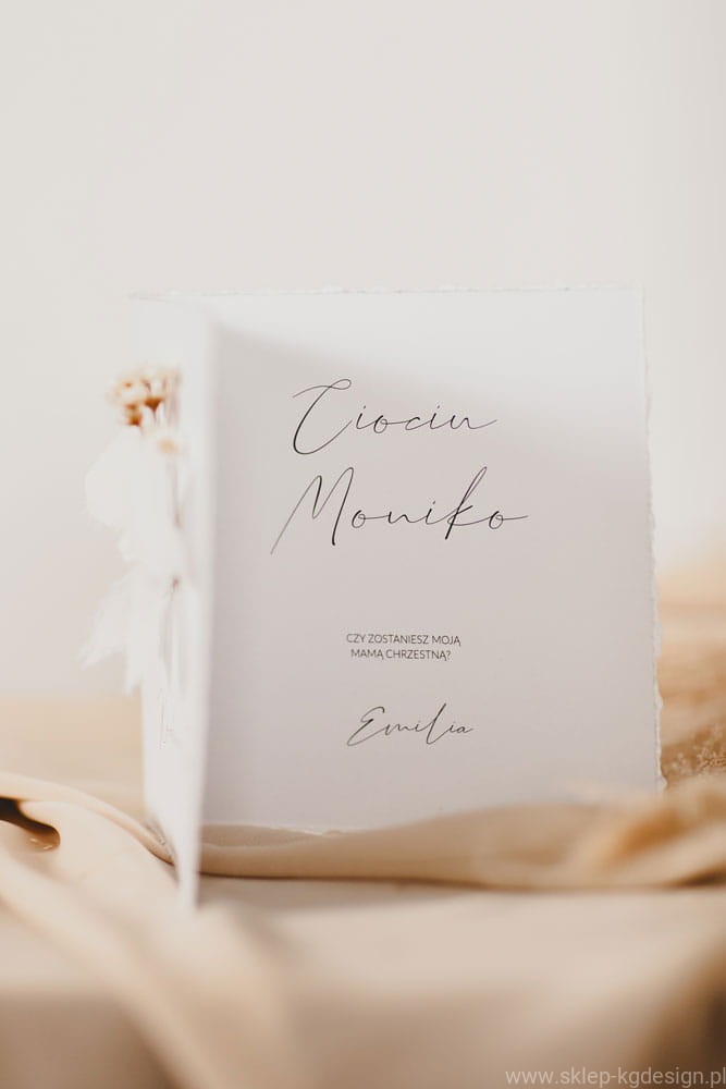 Składana, minimalistyczna karta drukowana na papierze eco kremowym w stylu boho z prośbą na Chrzest Święty dla Rodziców Chrzestnych: Czy zostaniesz moją matką chrzestną lub ojcem chrzestnym?
