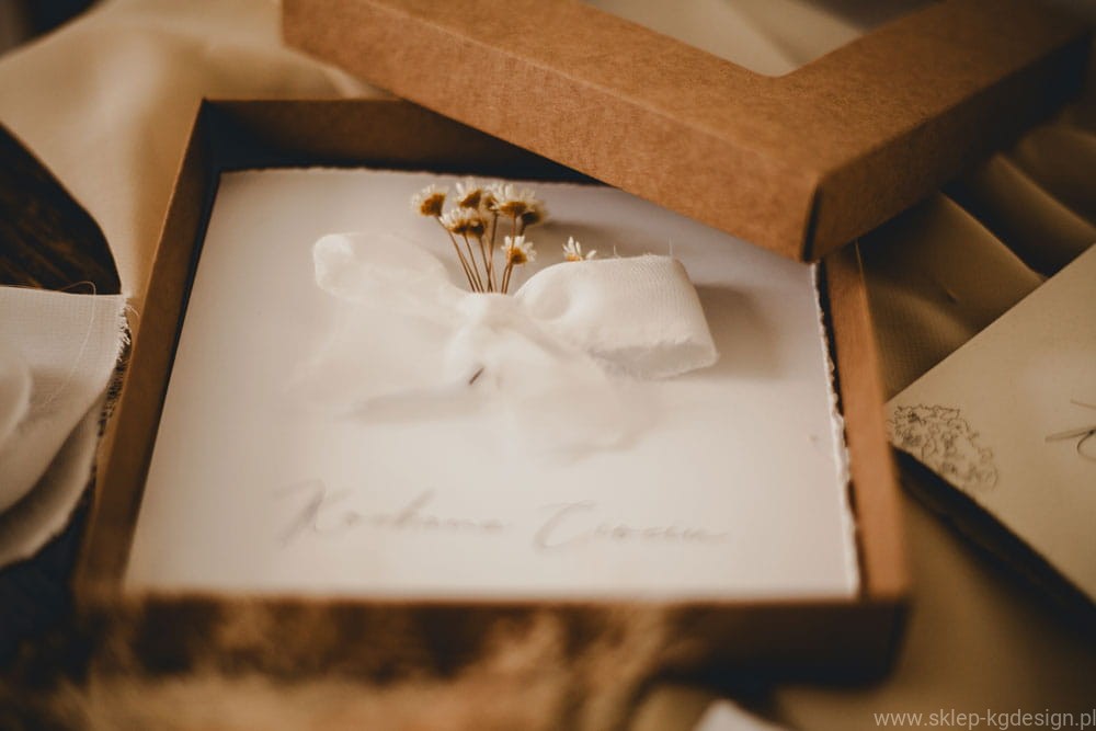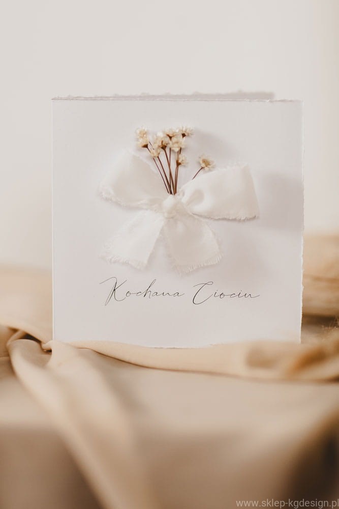 Minimalistyczna karta boho, idealna na zaproszenie dla Chrzestnej lub Chrzestnego. Karta wykonana z wysokiej jakości papieru w delikatnych odcieniach bieli, ozdobiona kokardką z materiału oraz drobnymi, suszonymi kwiatami. Stylowy napis „Kochana Ciociu” lub „Kochany Wujku” nadaje karcie osobistego charakteru, a ręcznie wykonane detale podkreślają jej wyjątkowość.