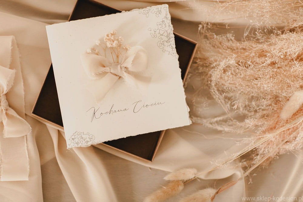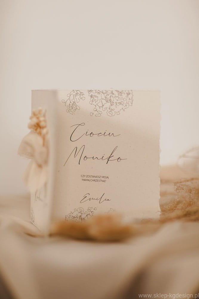 Pięknie wykonana karta z prośbą dla Chrzestnej lub Chrzestnego to wyjątkowy sposób, aby zaprosić ich do pełnienia tej ważnej roli. Karta utrzymana w delikatnych, naturalnych odcieniach beżu i kremu, ozdobiona jest ręcznie wykonaną kokardą z materiału oraz subtelną, suszoną gipsówką, co nadaje jej niepowtarzalnego charakteru. Minimalistyczny design z delikatnymi wzorami szkicu gipsówki na rogach oraz eleganckim napisem „Kochana Ciociu” sprawia, że karta idealnie wpasowuje się w aktualne trendy boho i rustykalne.