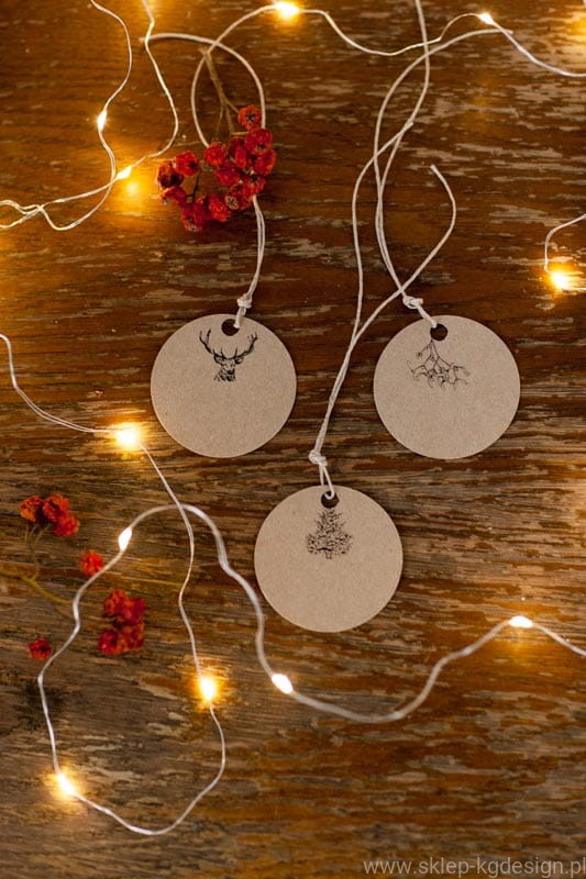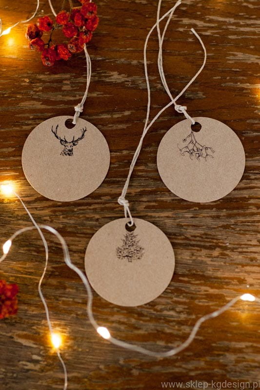 Bileciki do prezentów z autorską ilustracją drukowaną na szarym papierze ekologicznym.