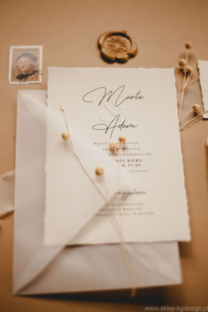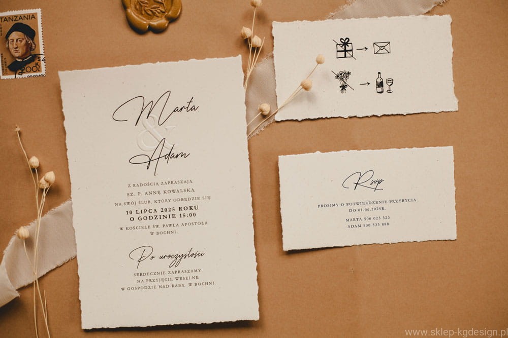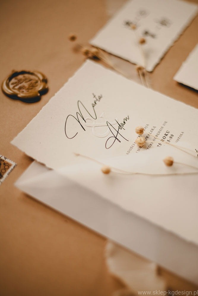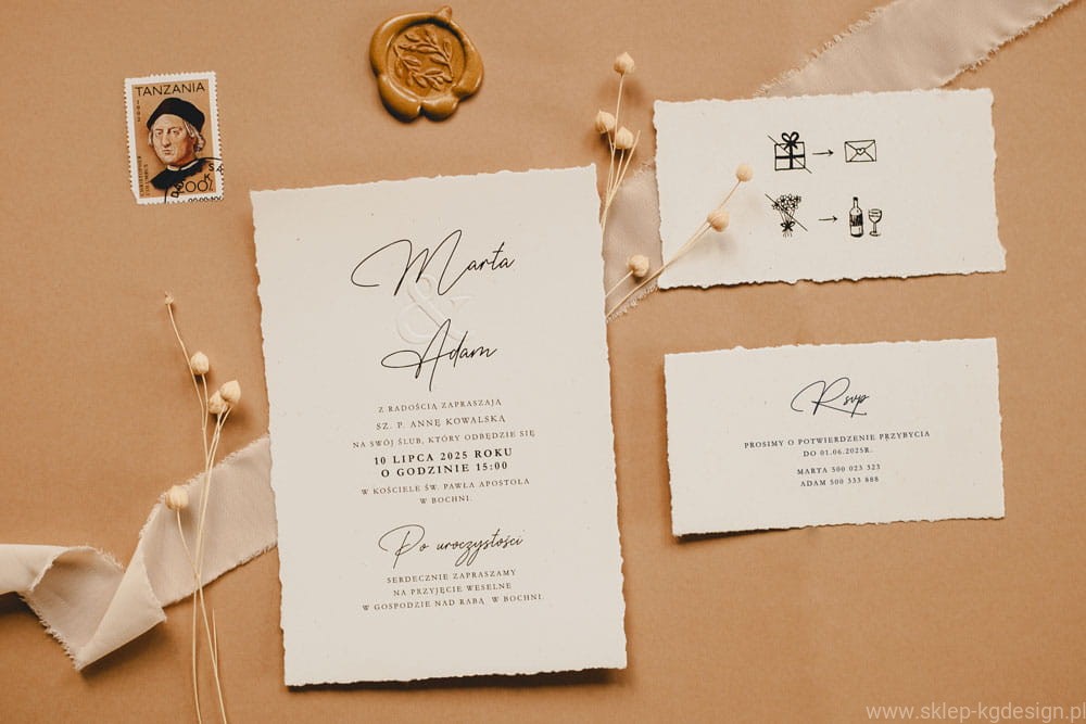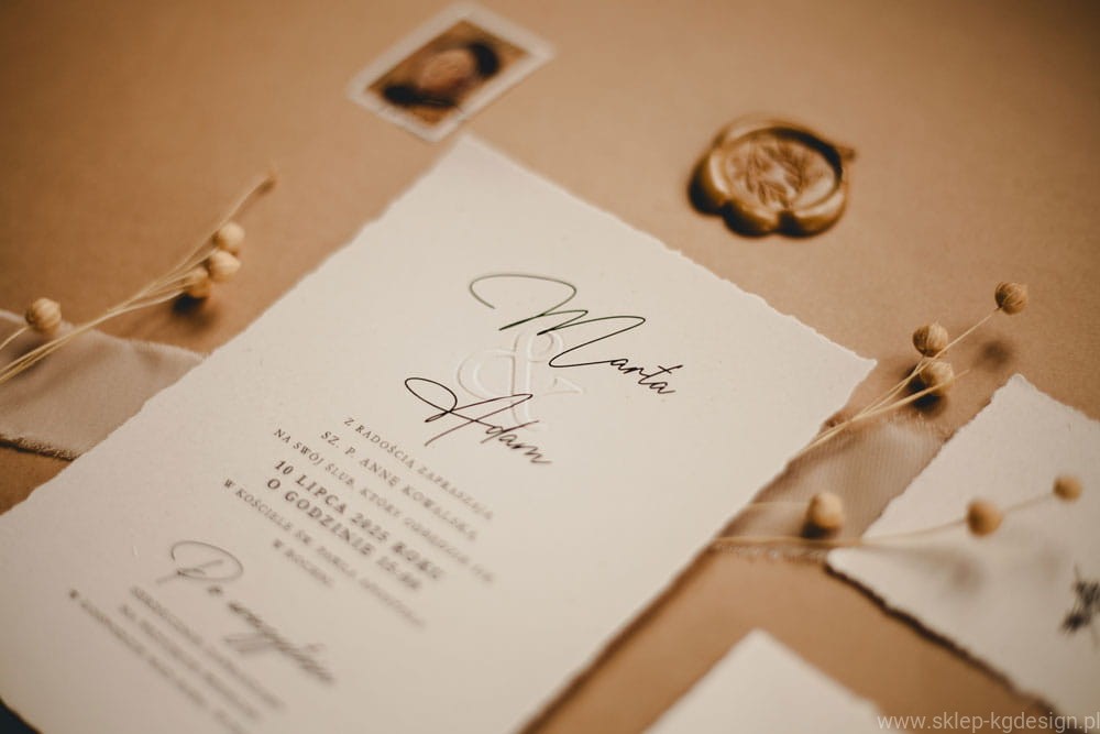 - Personalizowane zaproszenia ślubne boho z tłoczeniami – możliwość dodania imion, daty i miejsca uroczystości, aby każde zaproszenie było idealnie dopasowane do Twojej wizji.