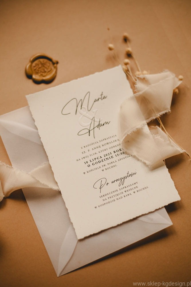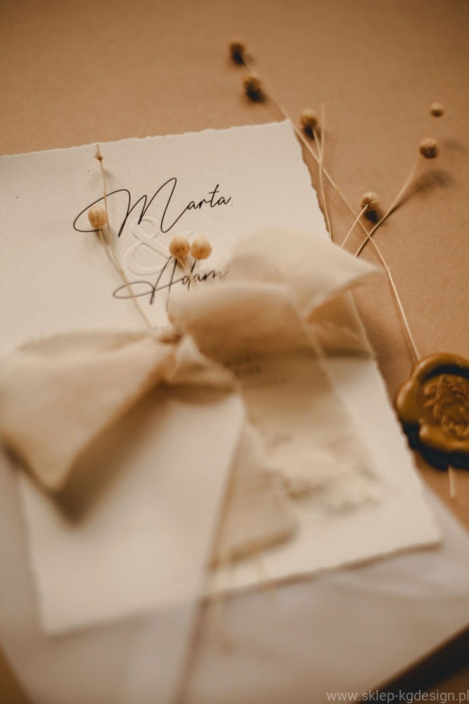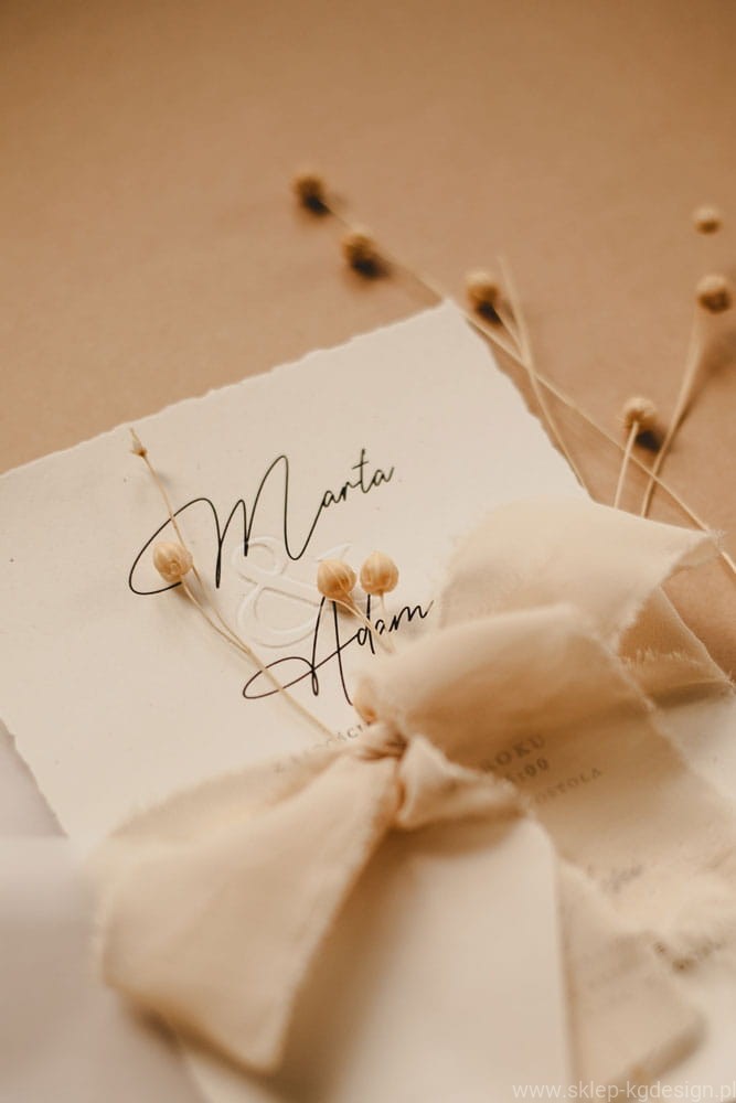 - Szyfonowe wstążki i eko-papier – każdy element zaproszeń, od delikatnych wstążek po ekologiczny papier, został starannie dobrany, aby wprowadzić gości w naturalną, romantyczną atmosferę wesela.