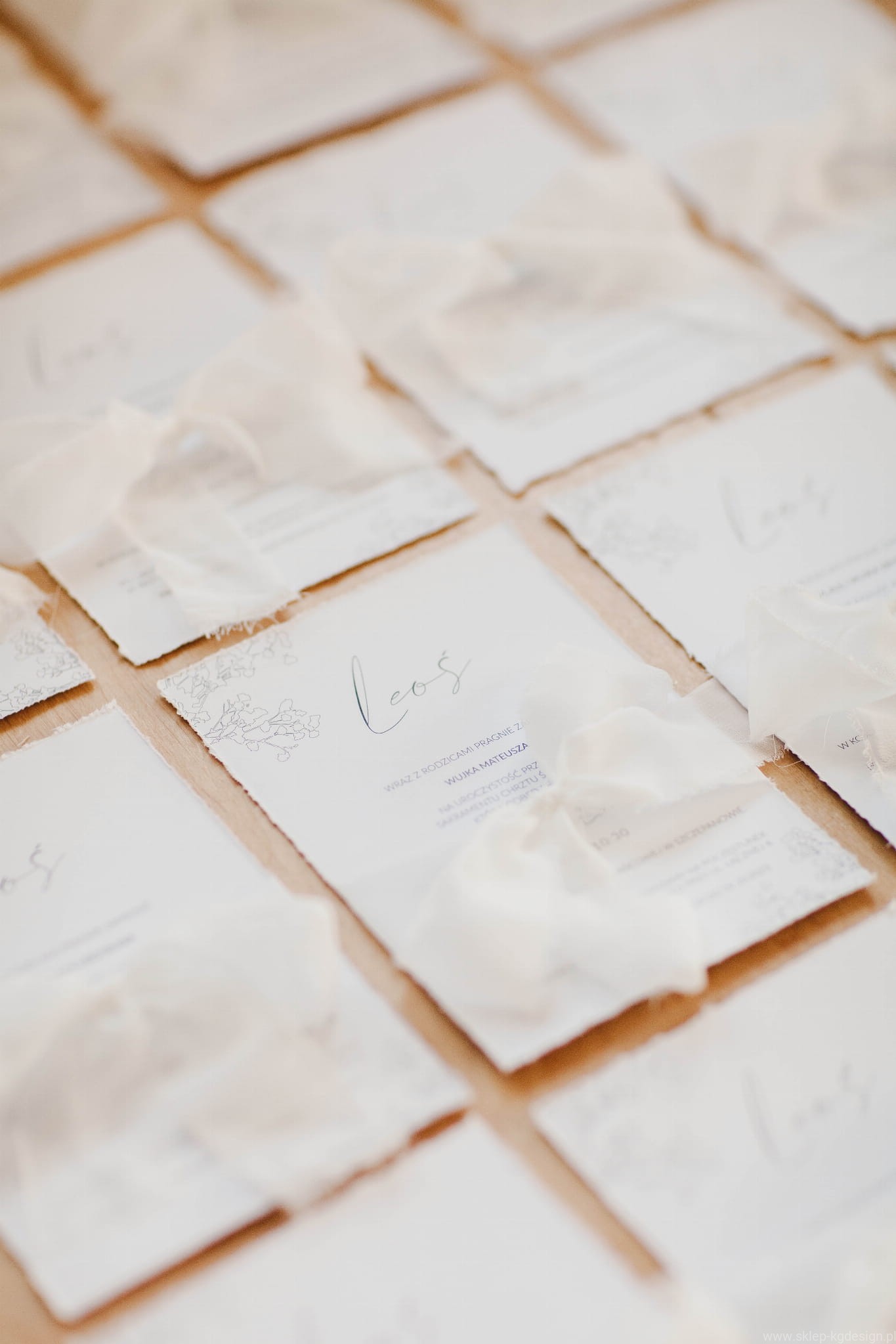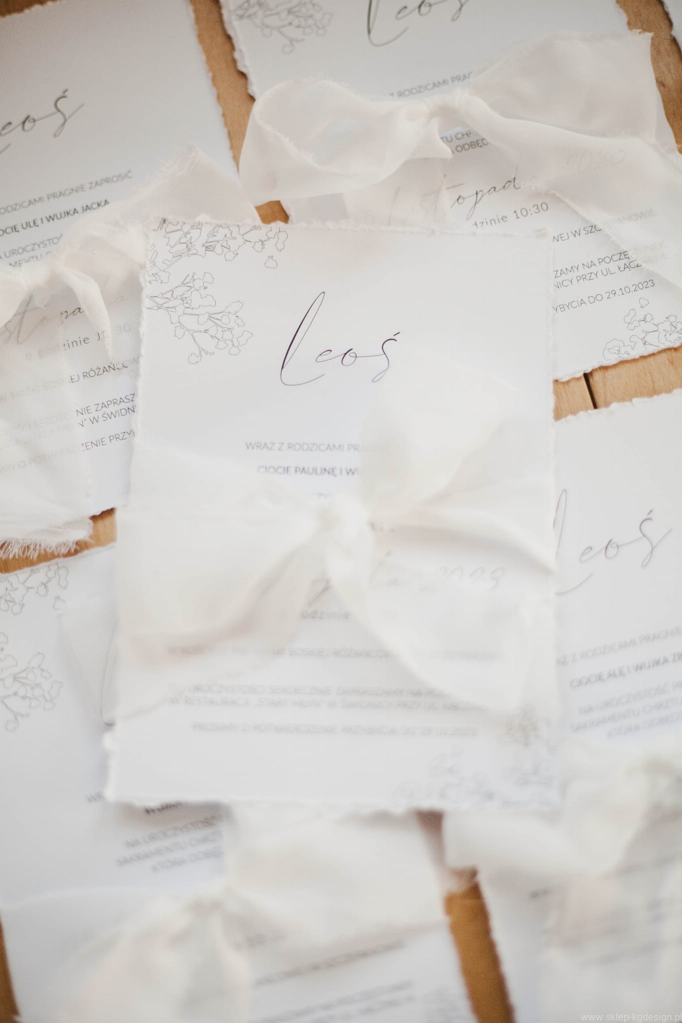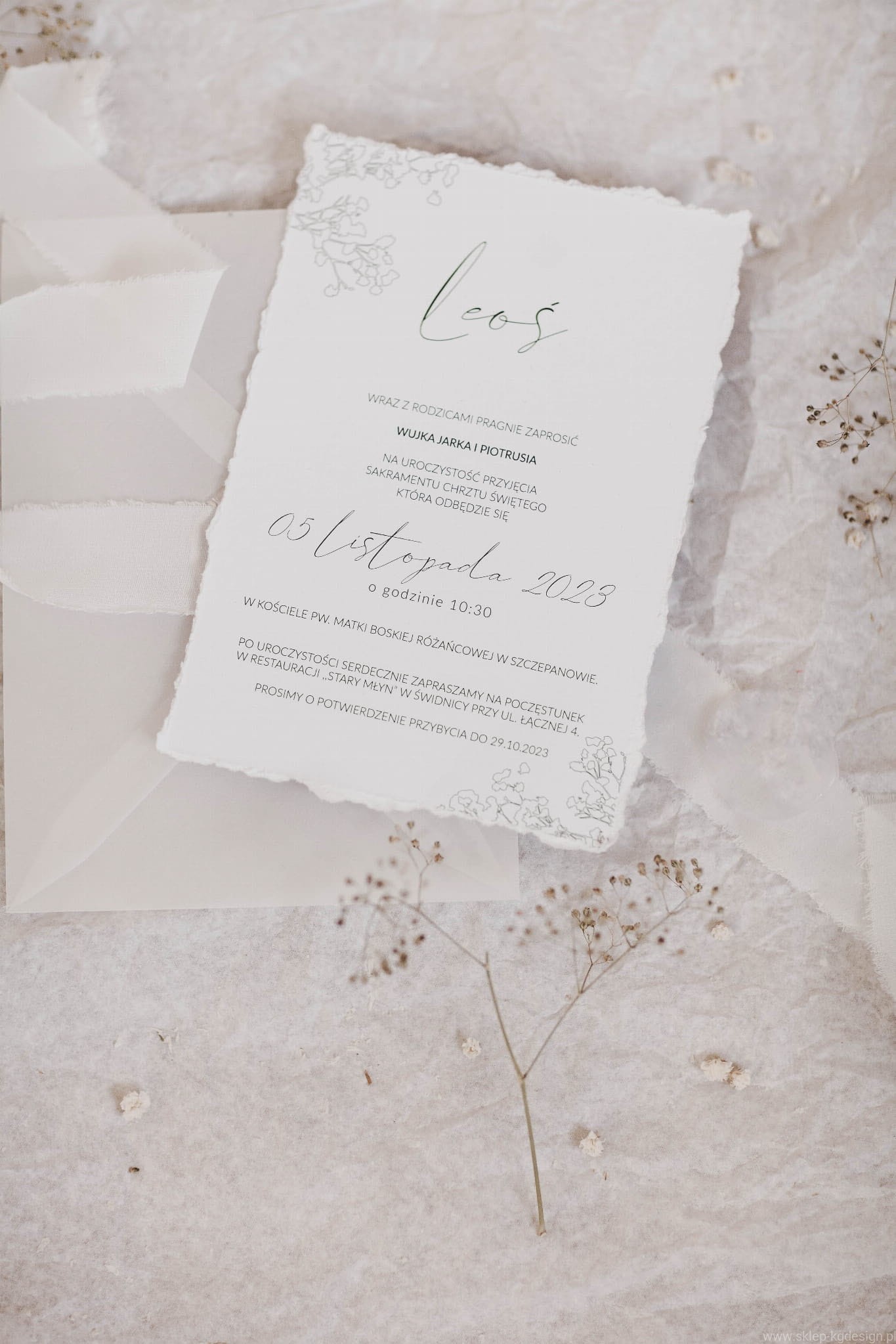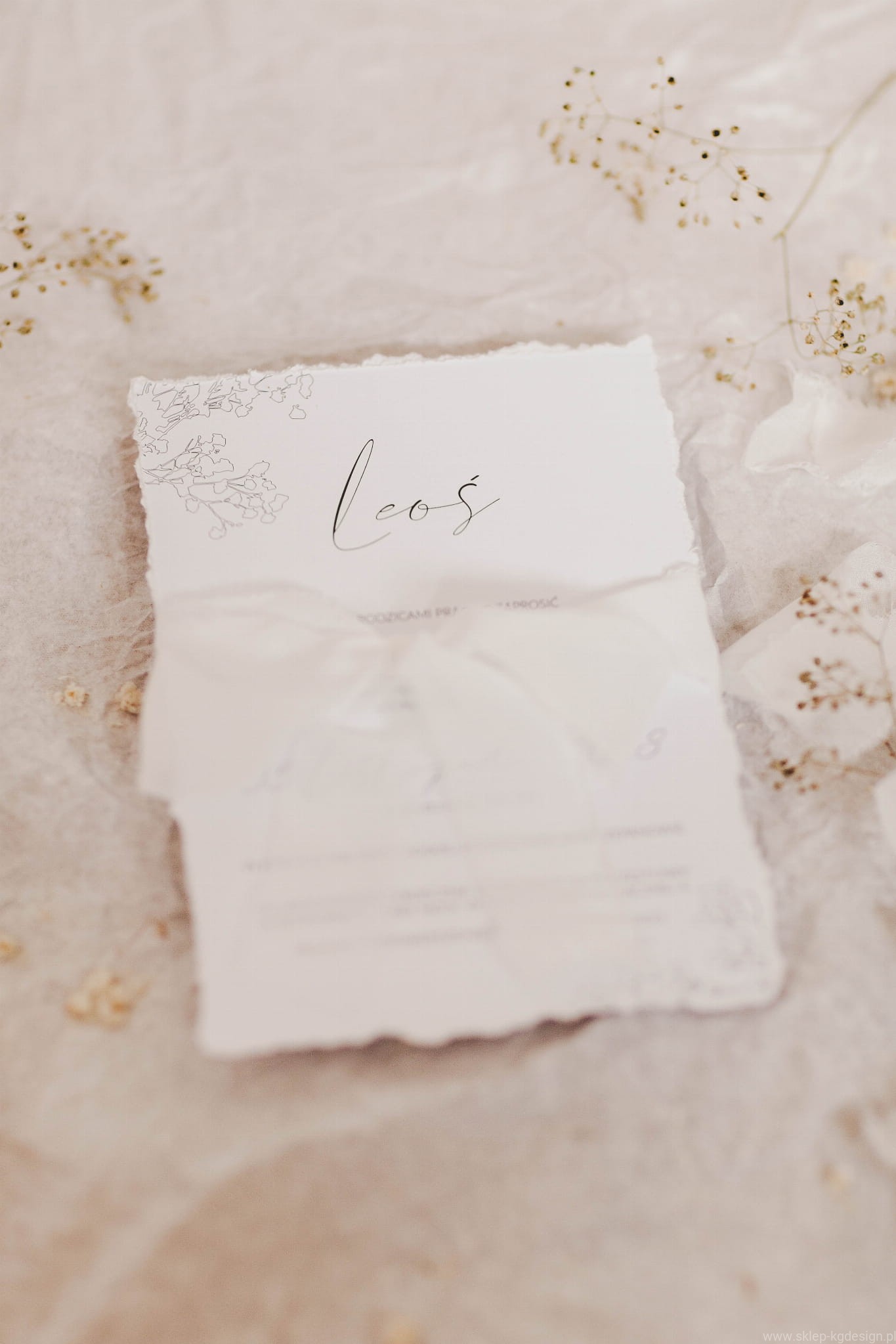 Zaproszenia są drukowane na papierze białym z nadrukowaną delikatną czarno-białą grafiką gipsówki w formie szkicu. Wstążka szyfonowa na zdjęciach jest w kolorze złamanej bieli.