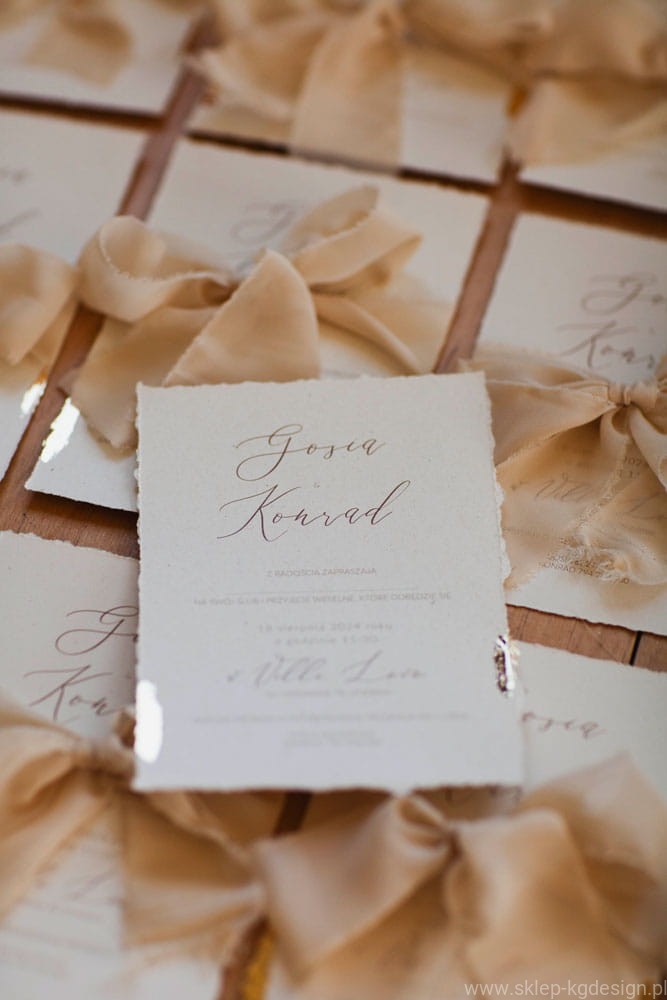 Zaproszenia są drukowane na kremowym papierze z targanymi brzegami. Do kompletu można domówić wstążkę szyfonową (może być w innym kolorze), kopertę transparentną lub w inną przesz Was wybraną.