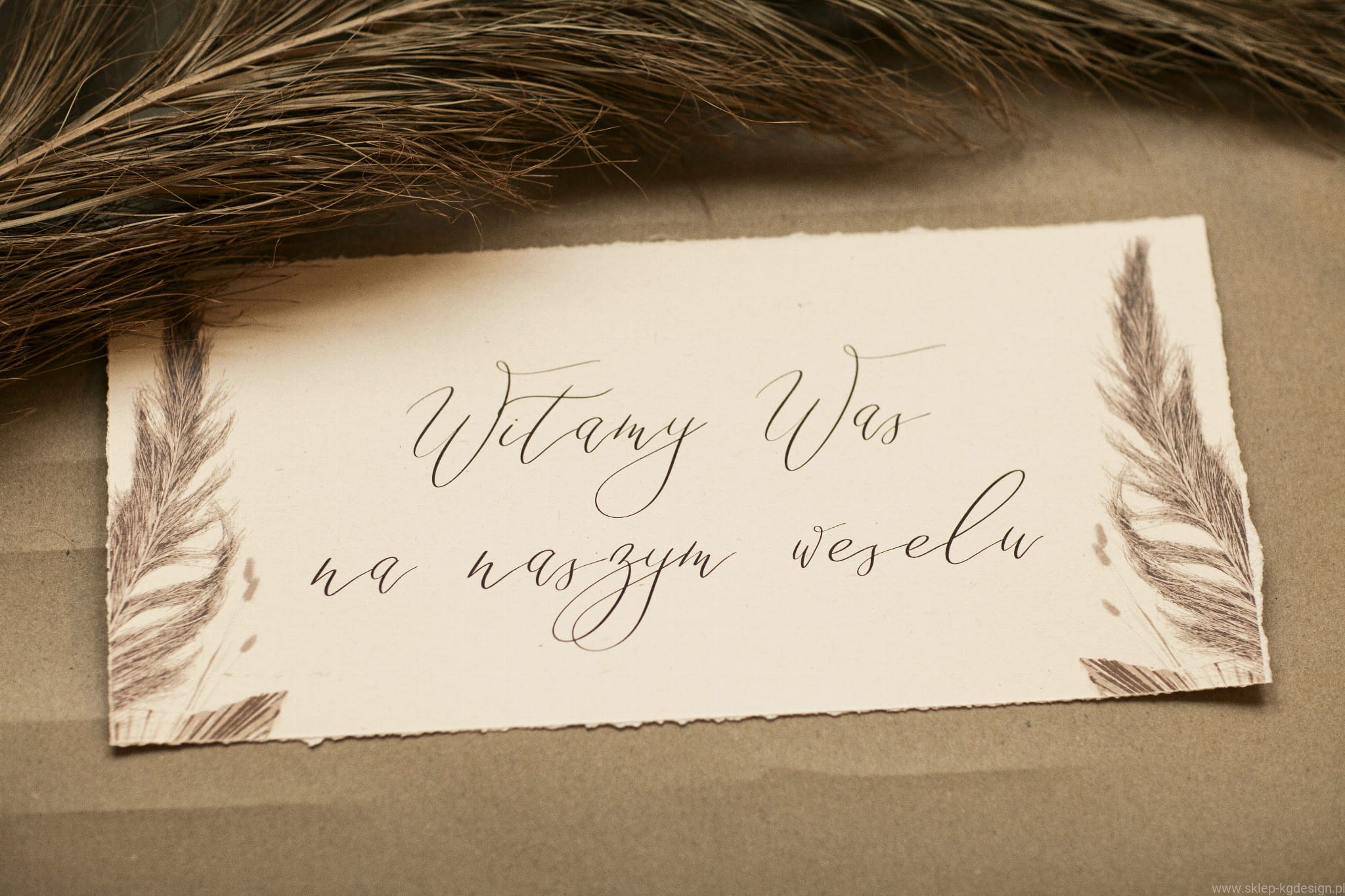 Karta powitalna z napisem: "Witamy Was na naszym weselu".