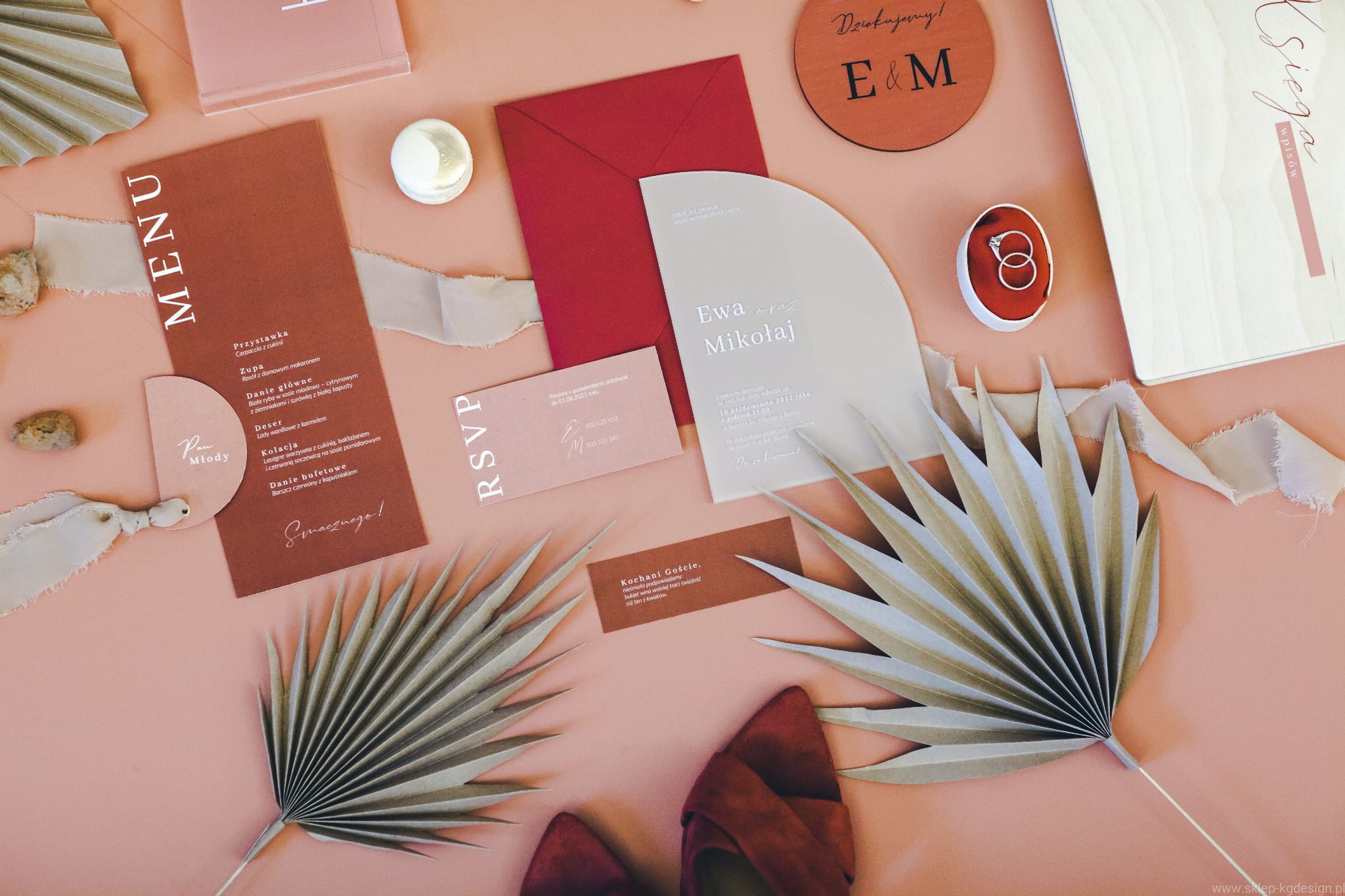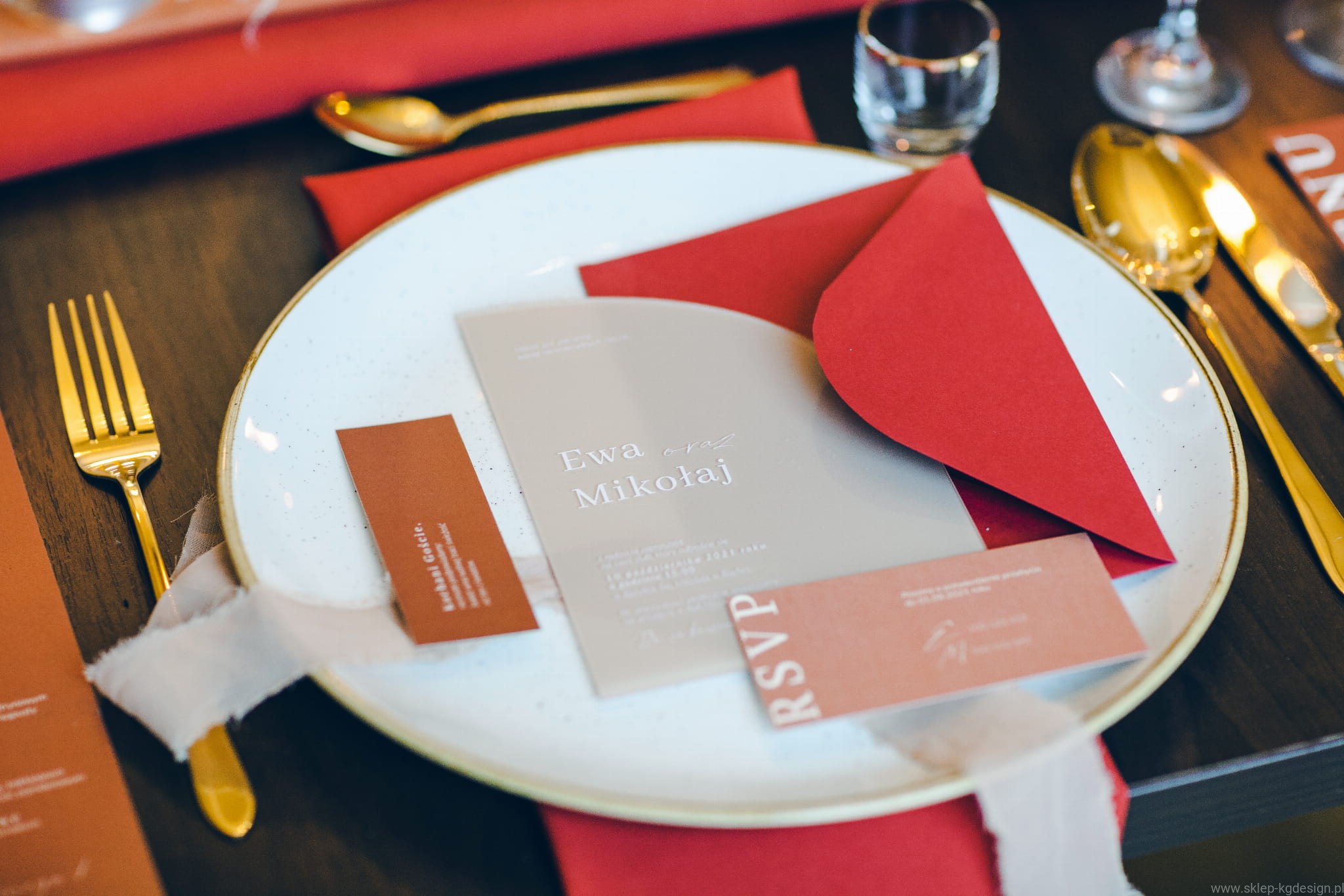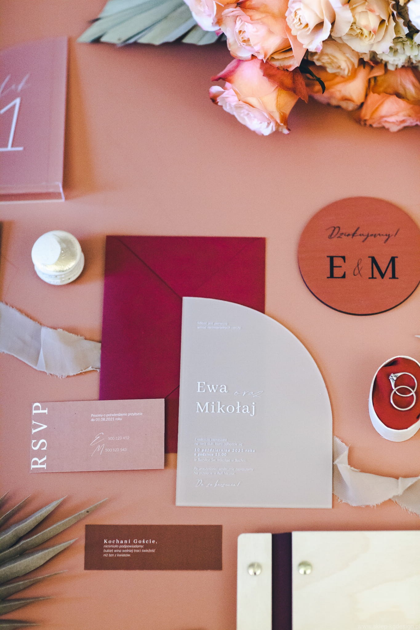 Geometryczne zaproszenie drukowane na pleksi z charakterystycznym wycięciem. Kolorystyka beż, teraktota oraz nadruk w kolorze bieli.