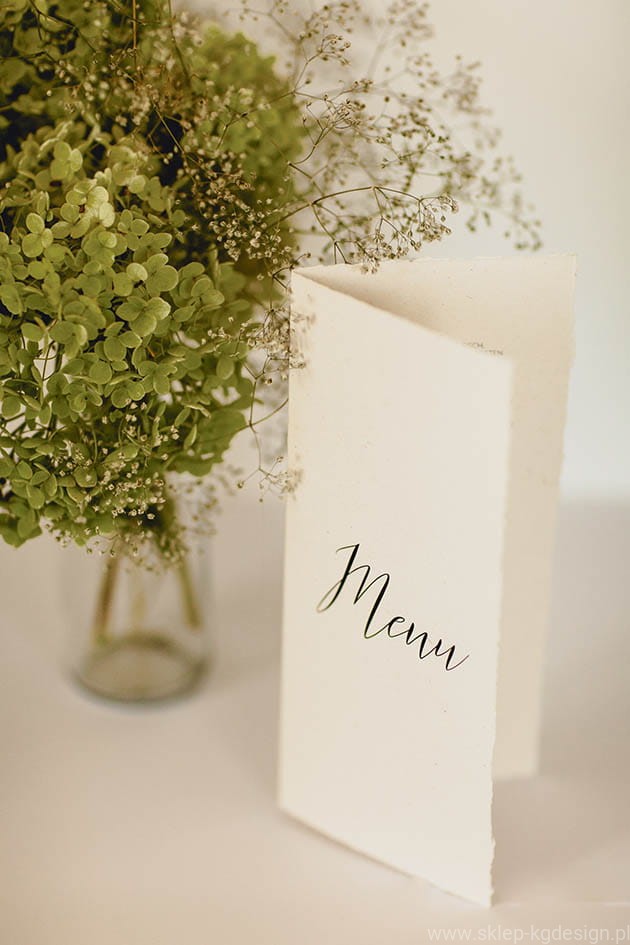 Menu drukowane na targanym papierze eko, kremowym. Składane, wolnostojące, w minimalistycznym stylu.