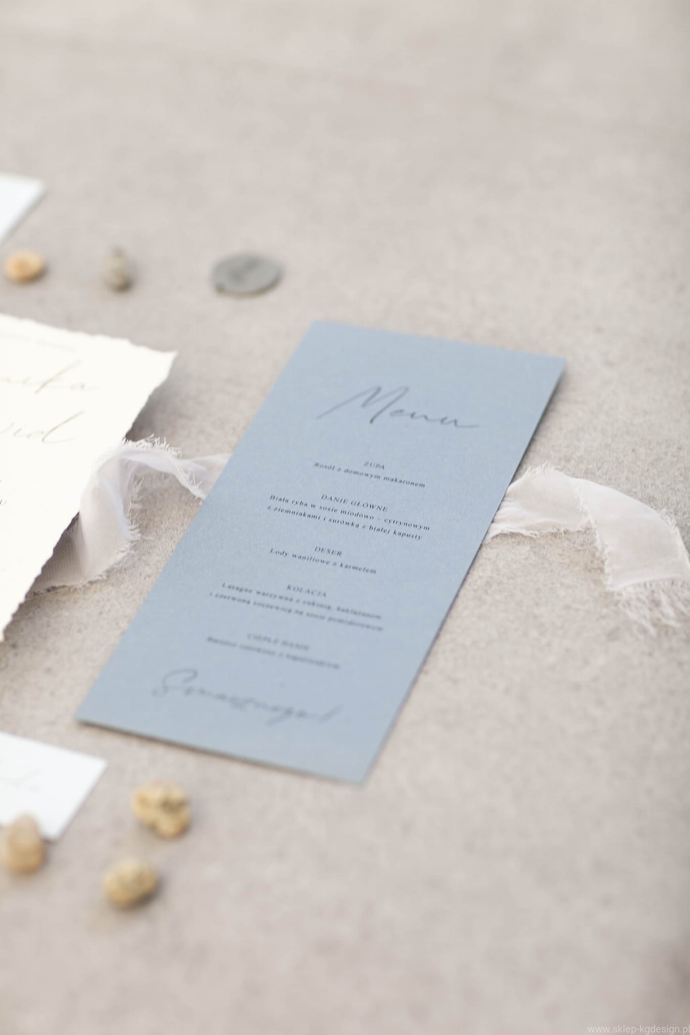 Menu leżące drukowane na papierze niebieskim, cięte prosto, nadruk czarny, seria DUSTY BLUE.