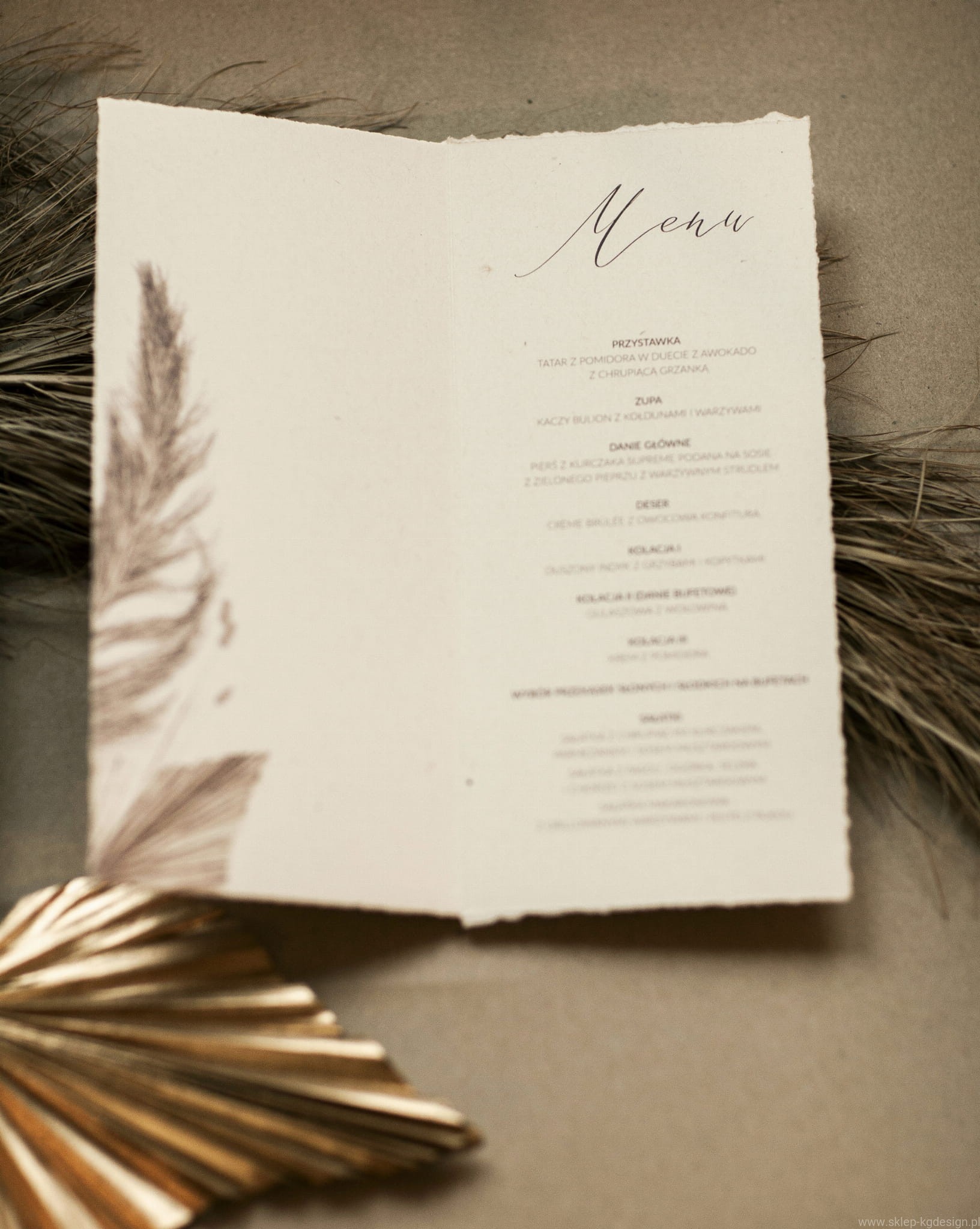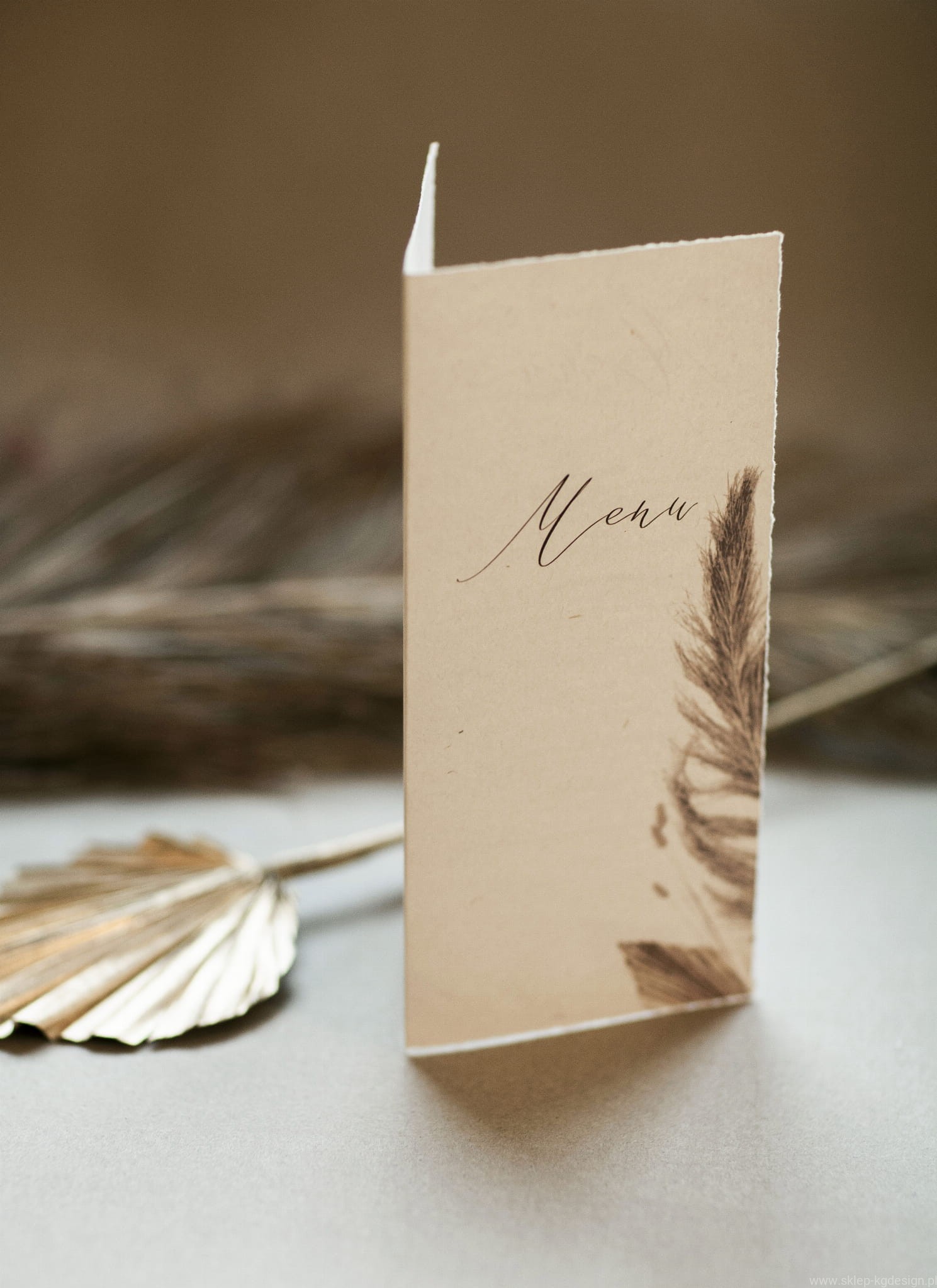 Stojące menu z grafiką suszonych liści i traw, drukowane na targanym papierze w kolorze kremowym. Papier ekologiczny z wtrąceniami.