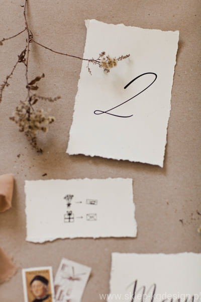 Numer stołu (lub nazwa stołu) drukowany na rwanym papierze eko, kremowym.