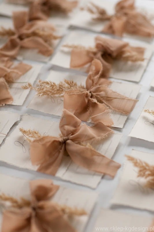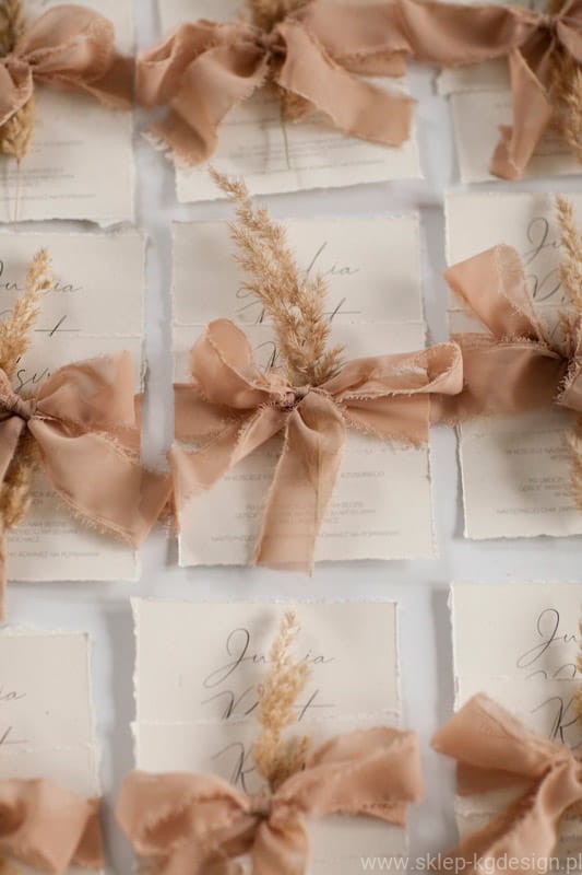 Naturalne, ekologiczne zaproszenia ślubne z gałązką zasuszonej trawy. Charakteru dodają rwane, czerpane brzegi karty głównej, rsvp oraz dodatków. Zaproszenia idealnie wpisują się w stylistykę boho.