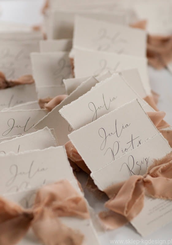 Zaproszenia są drukowane na papierze kremowym, ekologicznym z wtrąceniami. Dodatkowo lekkości dodaje materiałowa wstążka oraz transparentna koperta.