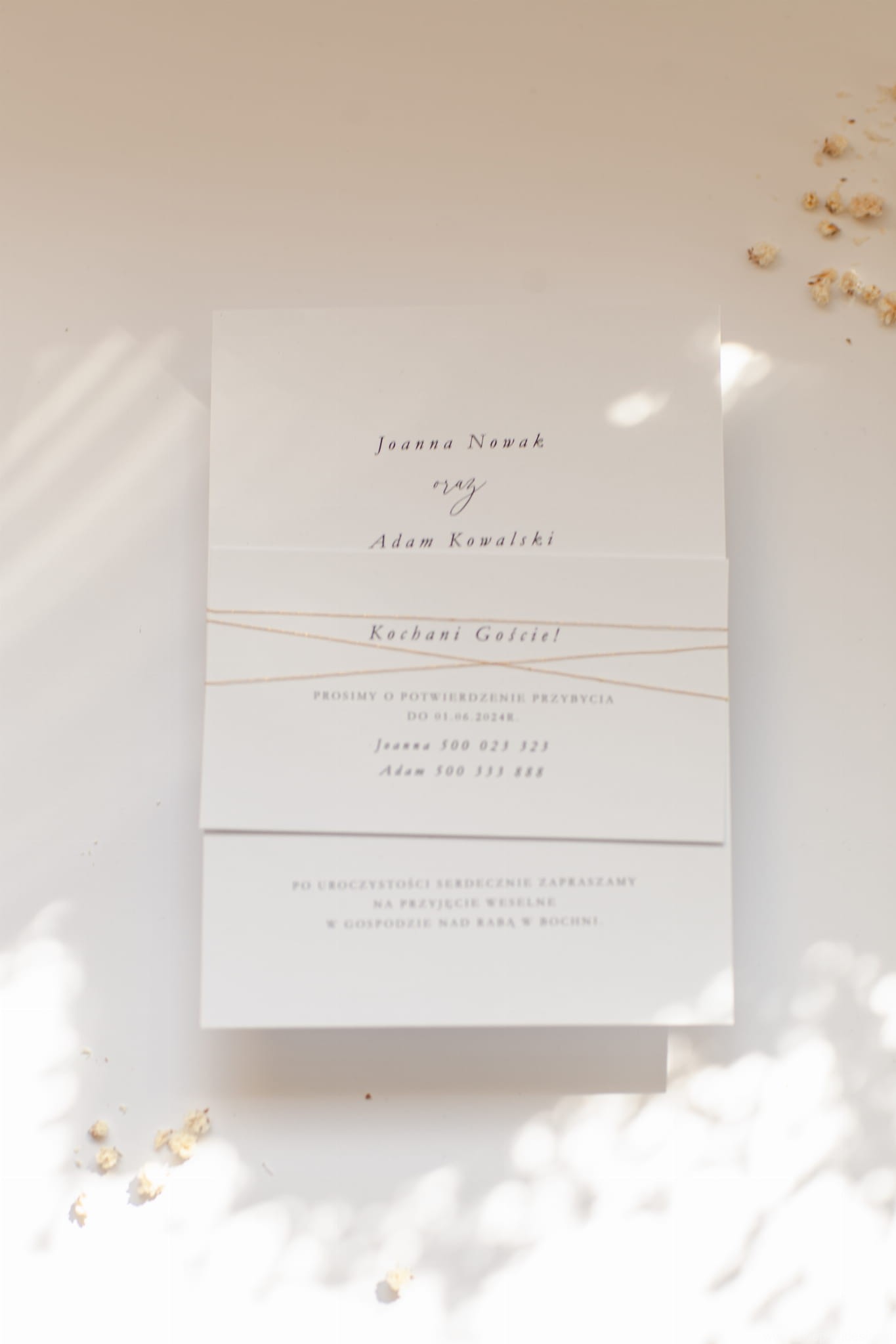 Zaproszenia są drukowane na białym papierze z prostymi brzegami.