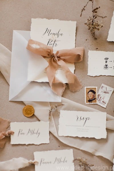 Naturalne, ekologiczne zaproszenia ślubne z kaligraficzną czcionką. Charakteru dodają rwane, czerpane brzegi karty głównej, rsvp oraz dodatków. Minimalizm rządzi! :)