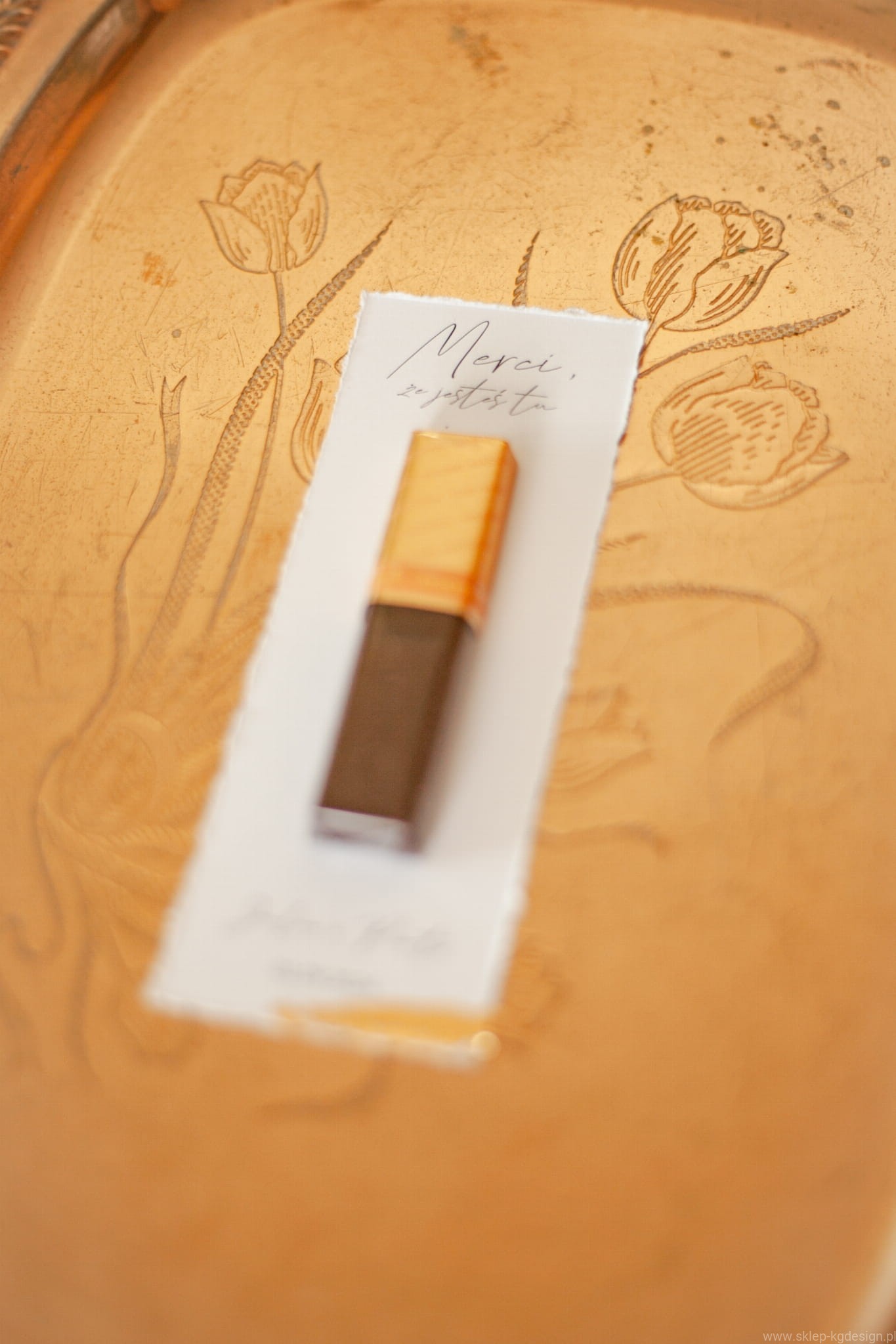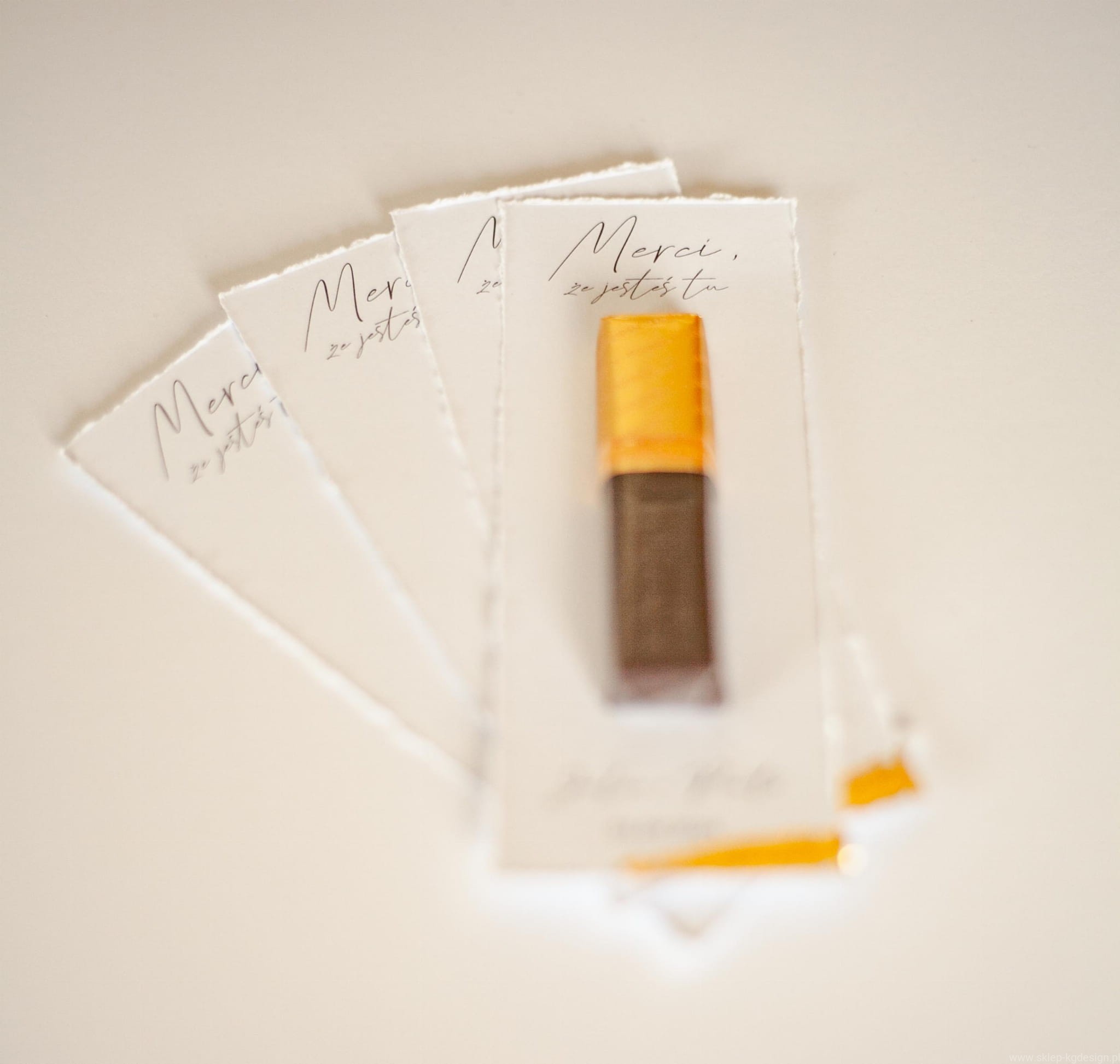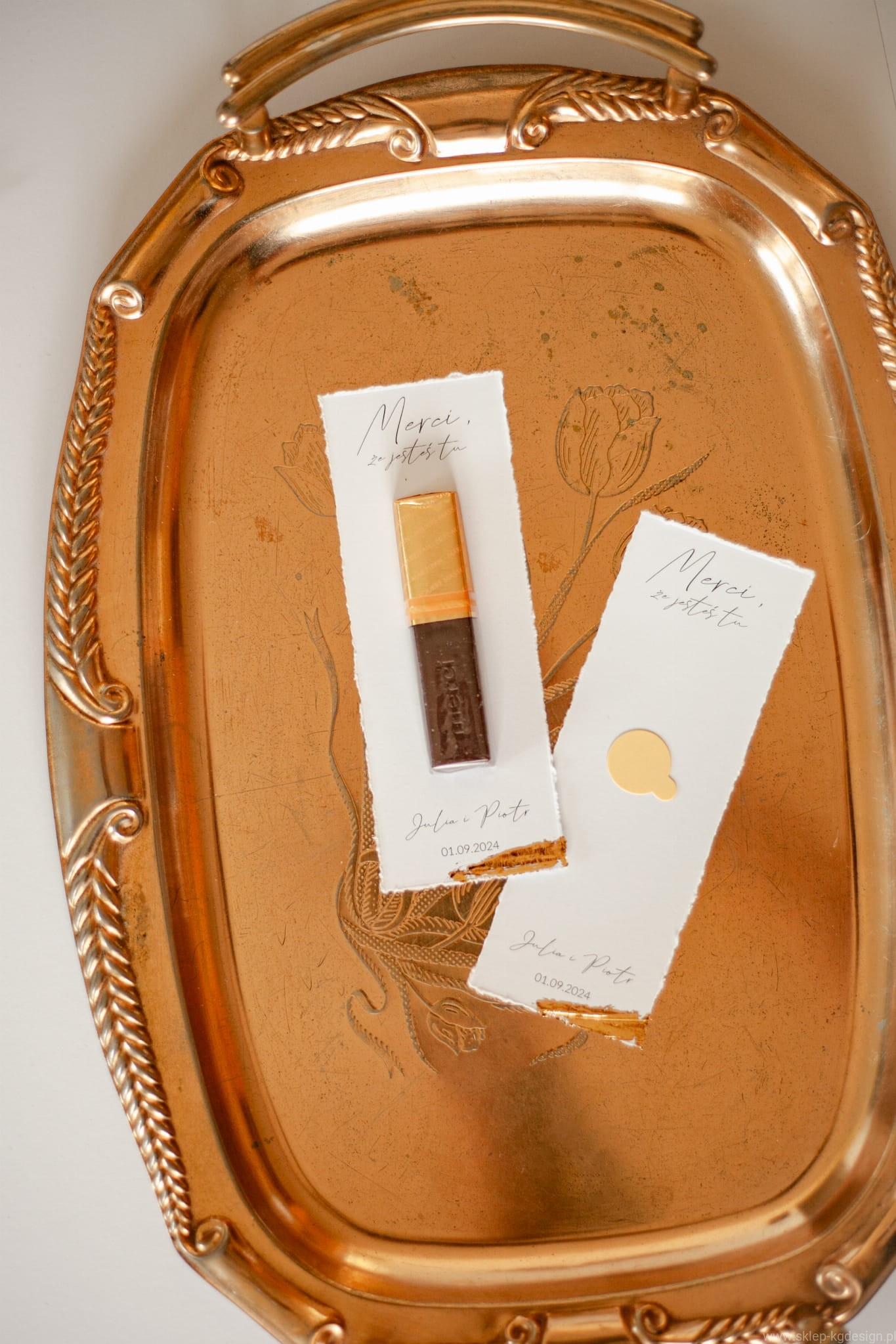 Podziękowanie na czekoladki Merci na białym papierze rwanym w minimalistycznym stylu. Dodatkowo uszlachetnione ręcznym złoceniem.