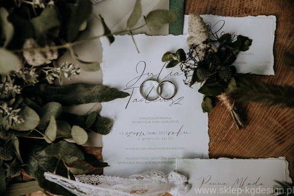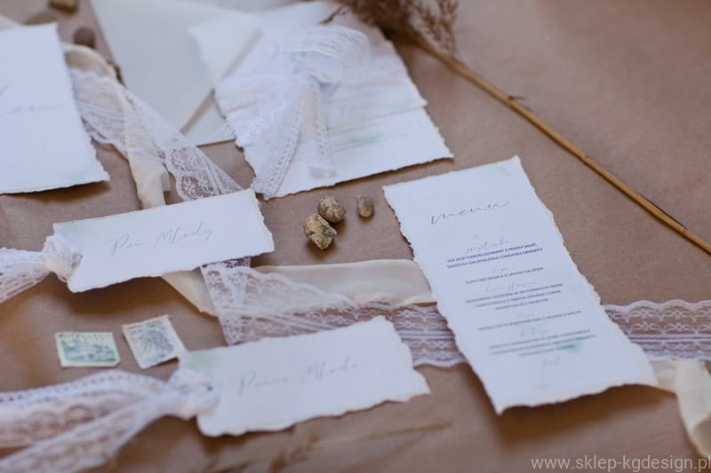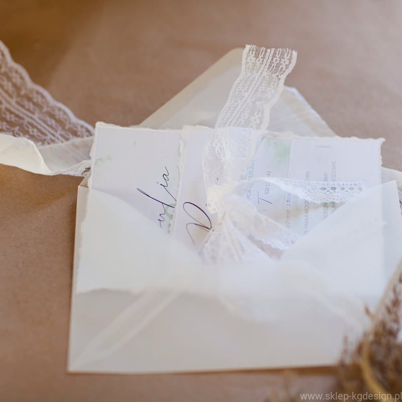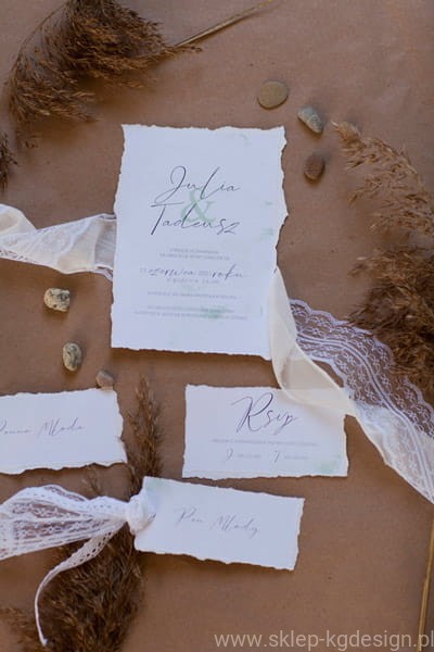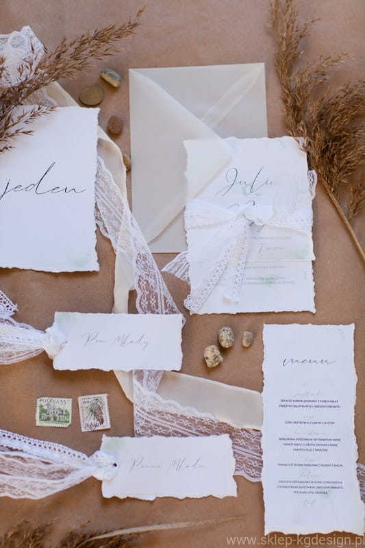 Targane zaproszenia w stylu boho z szeroką, koronkową białą wstążką oraz z zielonym akcentem kolorystycznym nadrukowanym na zaproszeniu.
