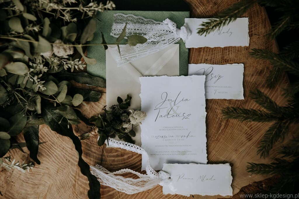 ZIELONE - minimalistyczne Zaproszenie w stylu boho z koronką i zielonym akcentem