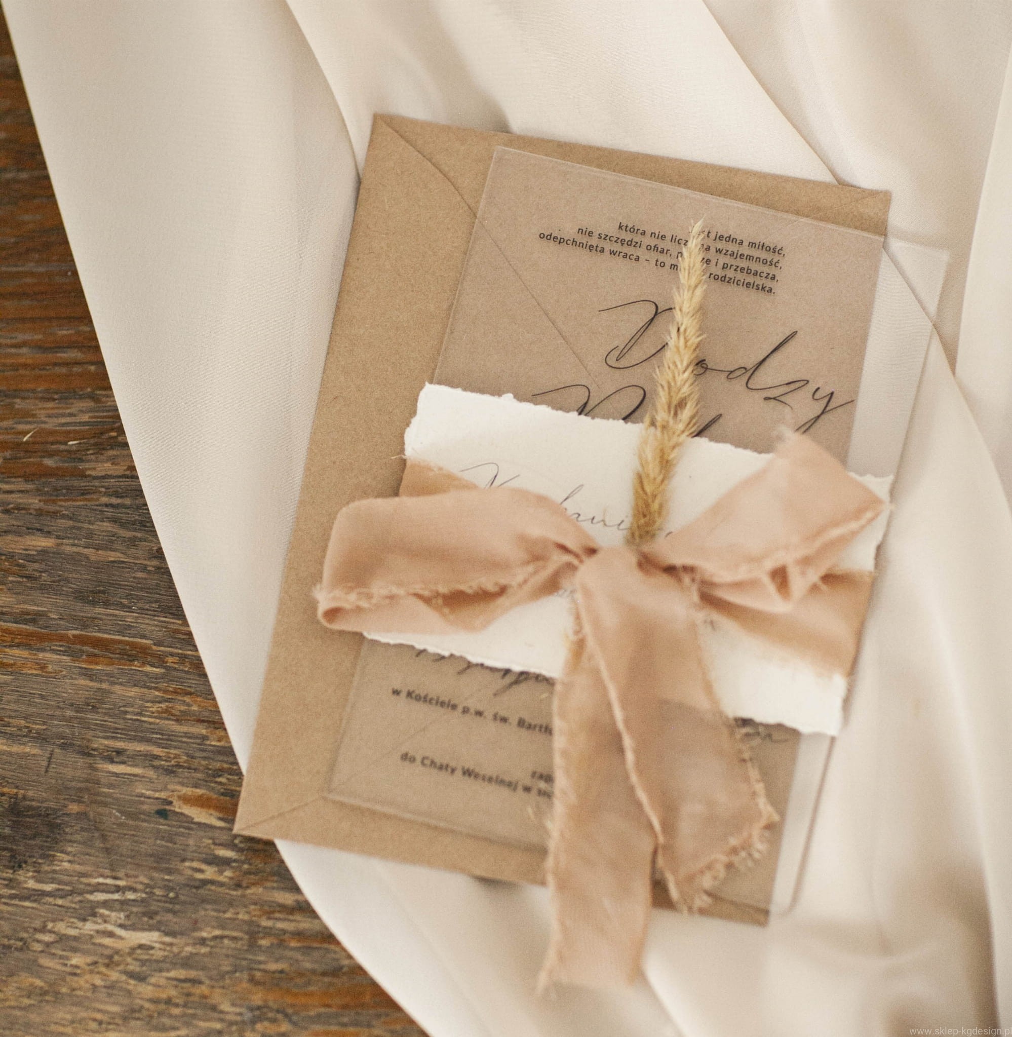 W cenie: zaproszenie, wstążka ciemny beż, suszona trawa, koperta eco, karteczka z prośbą o błogosławieństwo (ok 6x11cm).