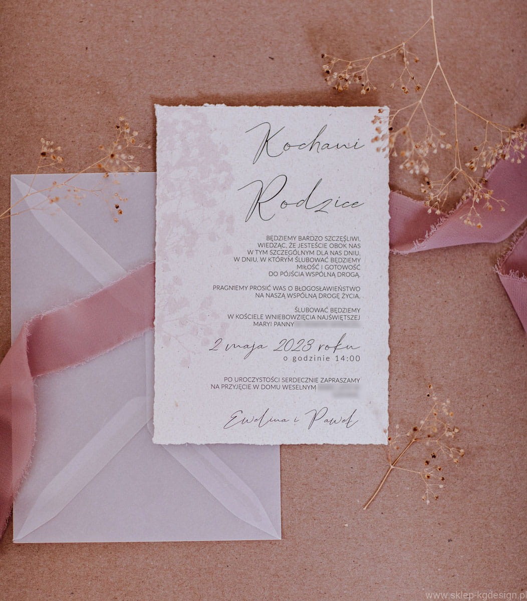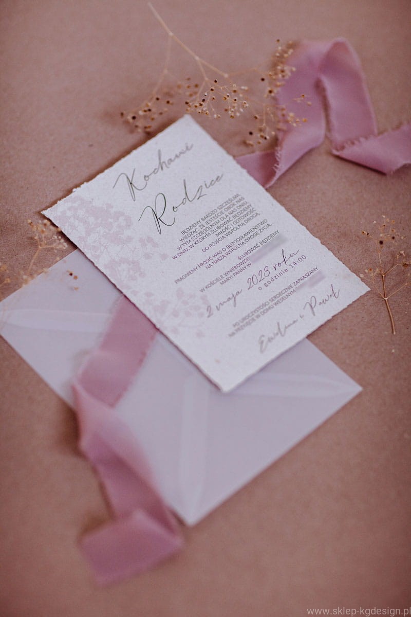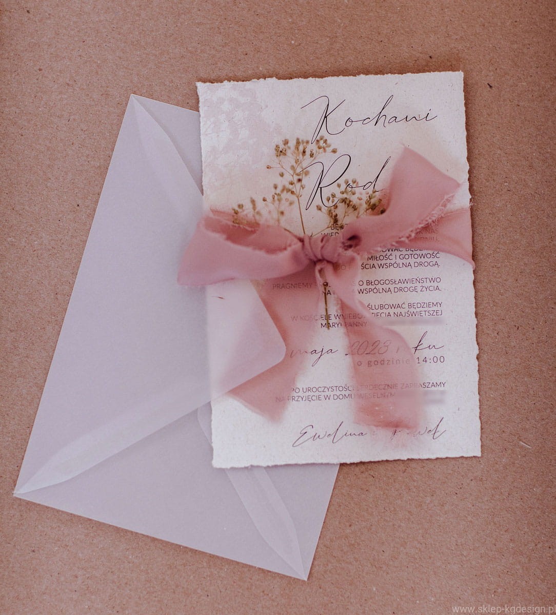 W cenie: zaproszenie, wstążka ciemny zgaszony róż, suszona gipsówka, koperta transparentna.
