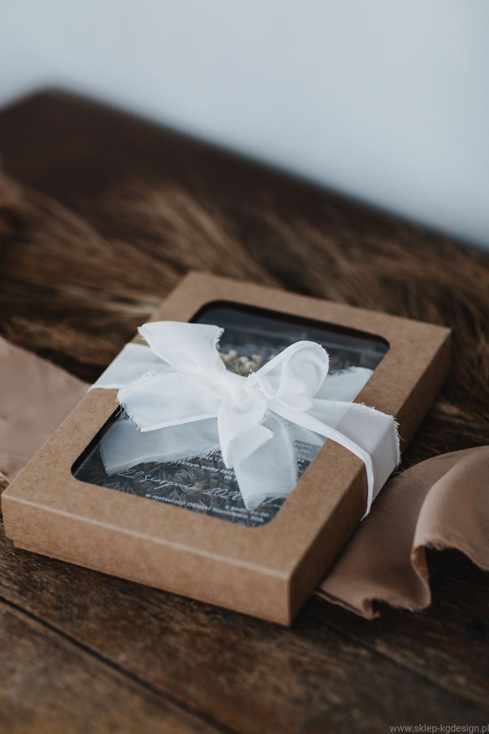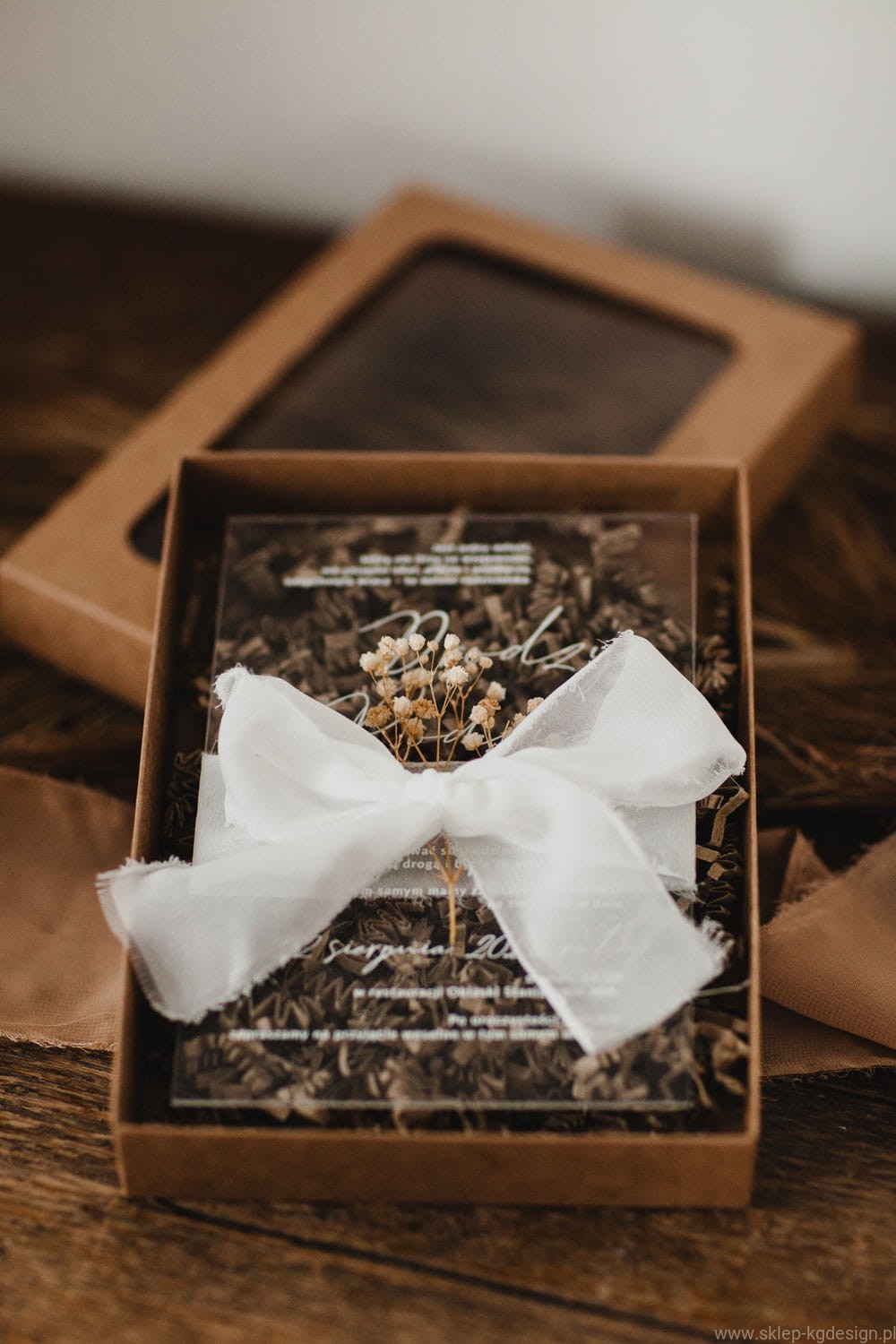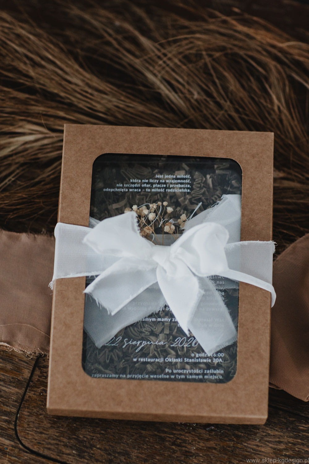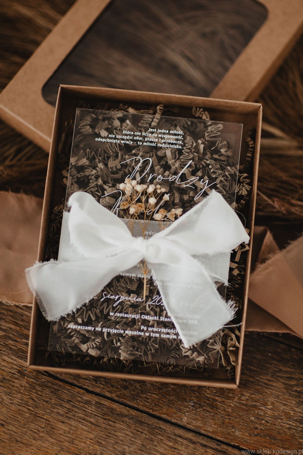 Zaproszenie umieszczone jest w eleganckim pudełeczku, w którym znajduje się przeźroczysta karta drukowana na pleksie (szkło akrylowe) z personalizowanym tekstem. Delikatna suszona gipsówka oraz biała szyfonowa wstążka, wiązana ręcznie, nadają całości subtelny, naturalny charakter w stylu boho. Stonowana kolorystyka i minimalistyczna forma podkreślają wyjątkowość chwili, nie przytłaczając jej nadmiarem ozdób.