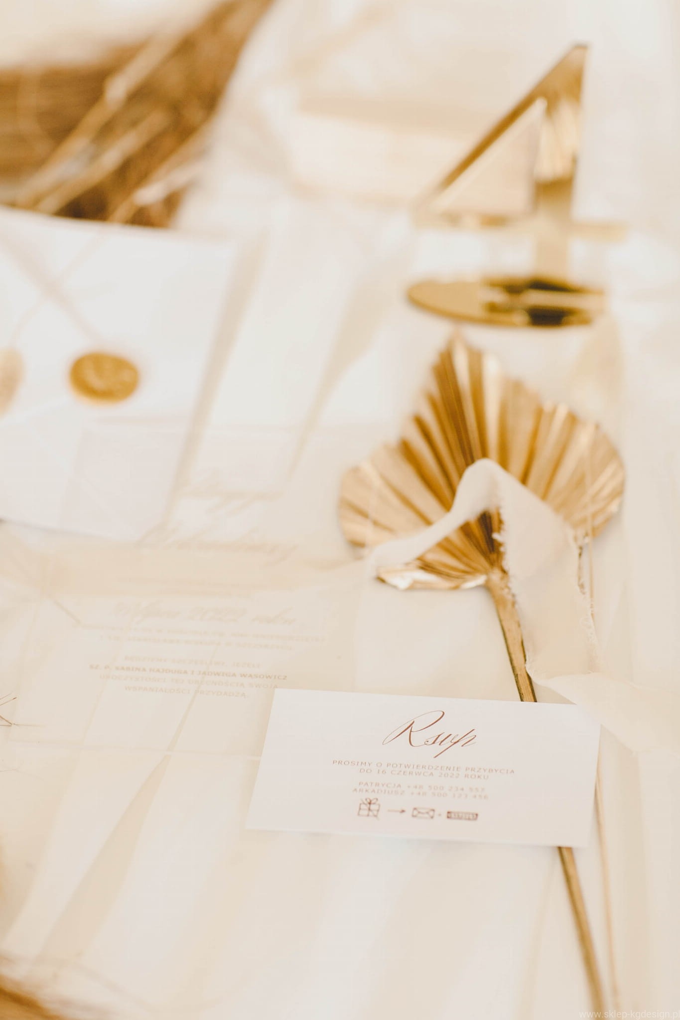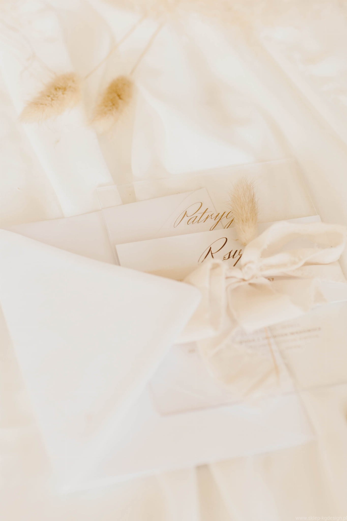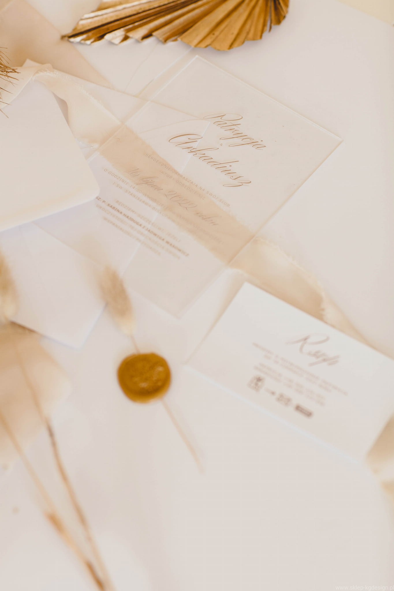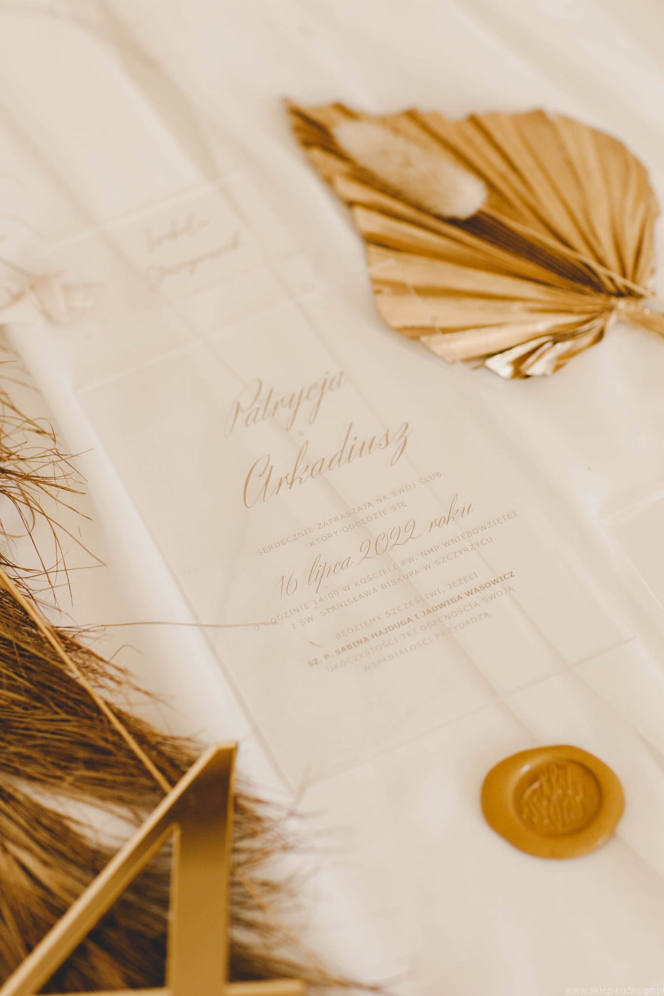 Transparentne i minimalistyczne zaproszenie drukowane na szkle akrylowym. Nadruk w kolorze złotym matowym.