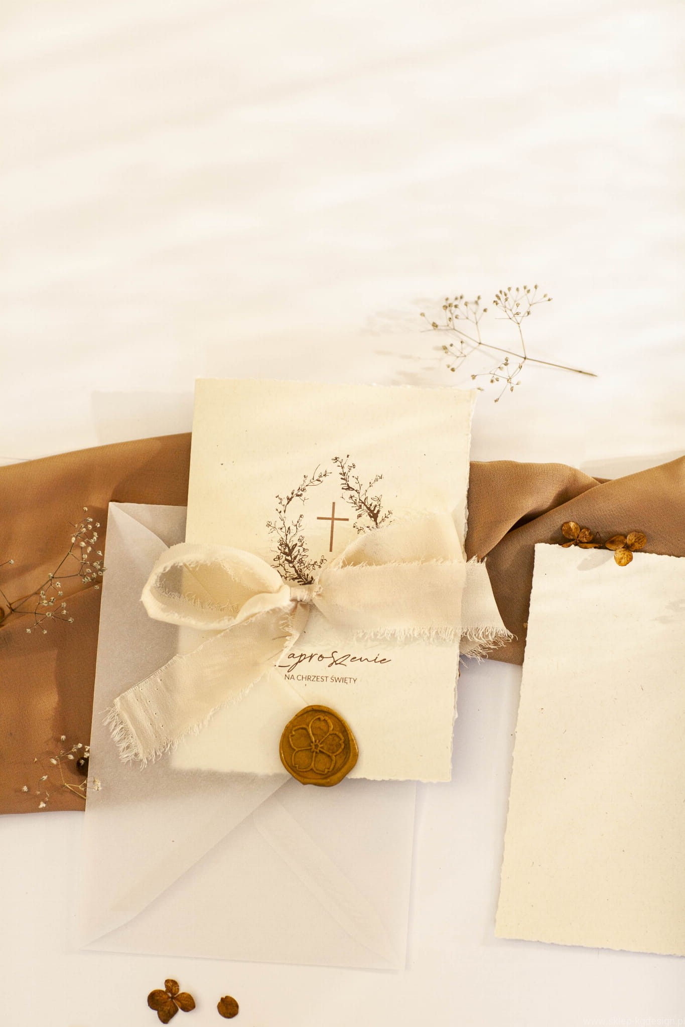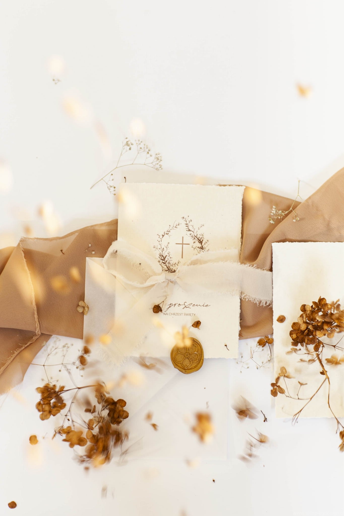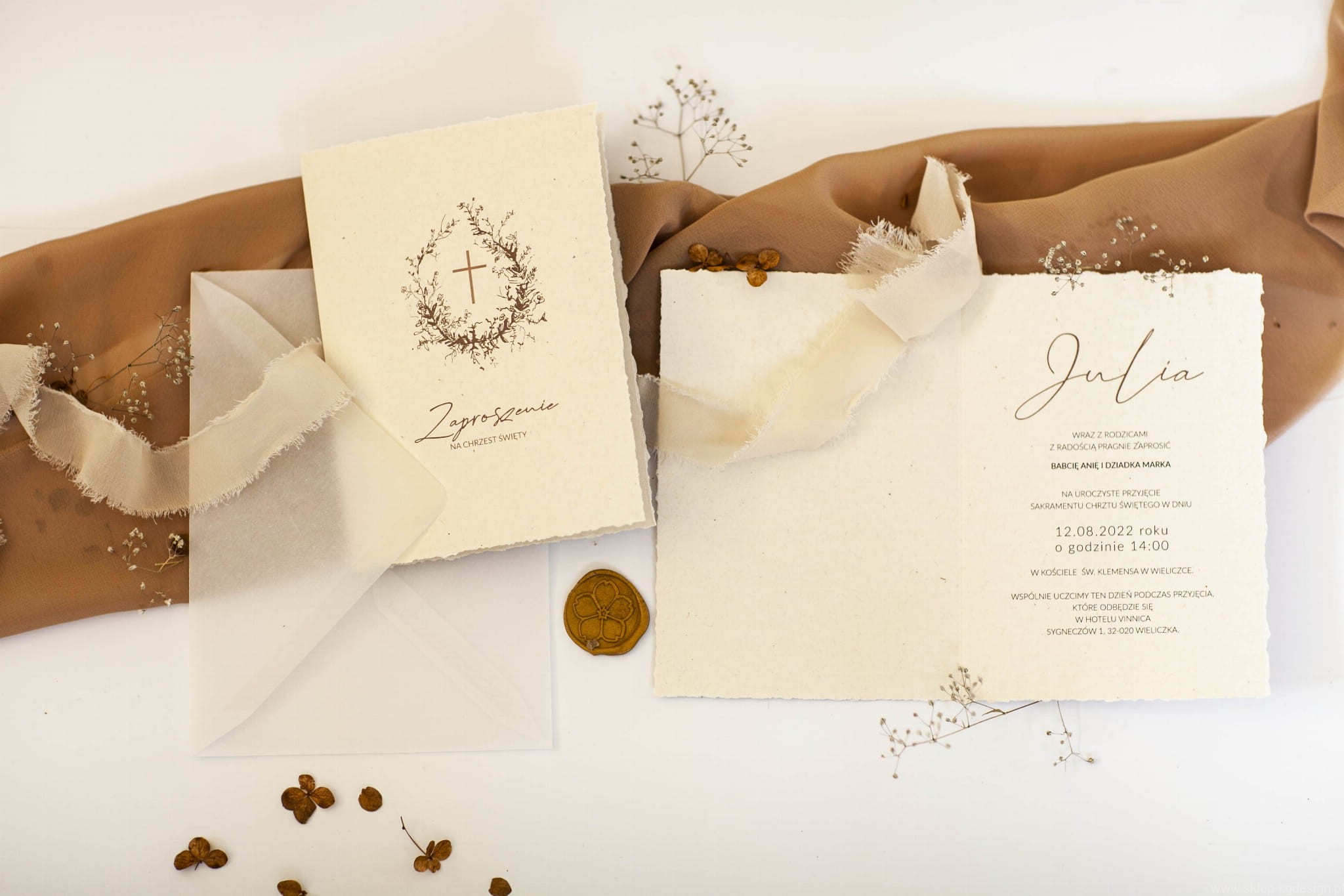 Zaproszenie na chrzest święty w stylu boho z rwanymi bokami i delikatną grafiką. Drukowane na papierze kremowym, ekologicznym z wtrąceniami. Do kompletu na zdjęciach wstążka szyfonowa rwana w kolorze jasnego beżu oraz transparentna koperta.