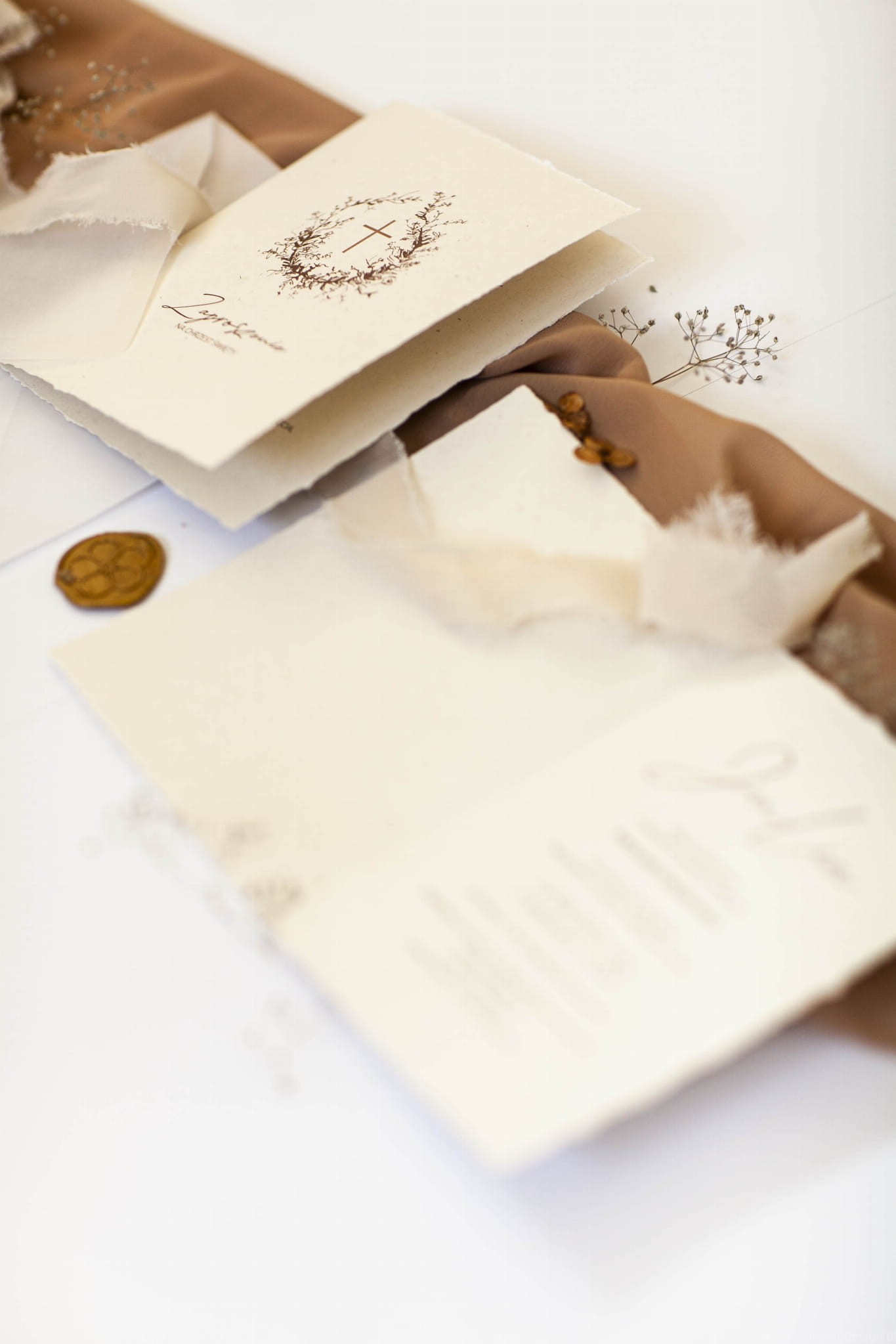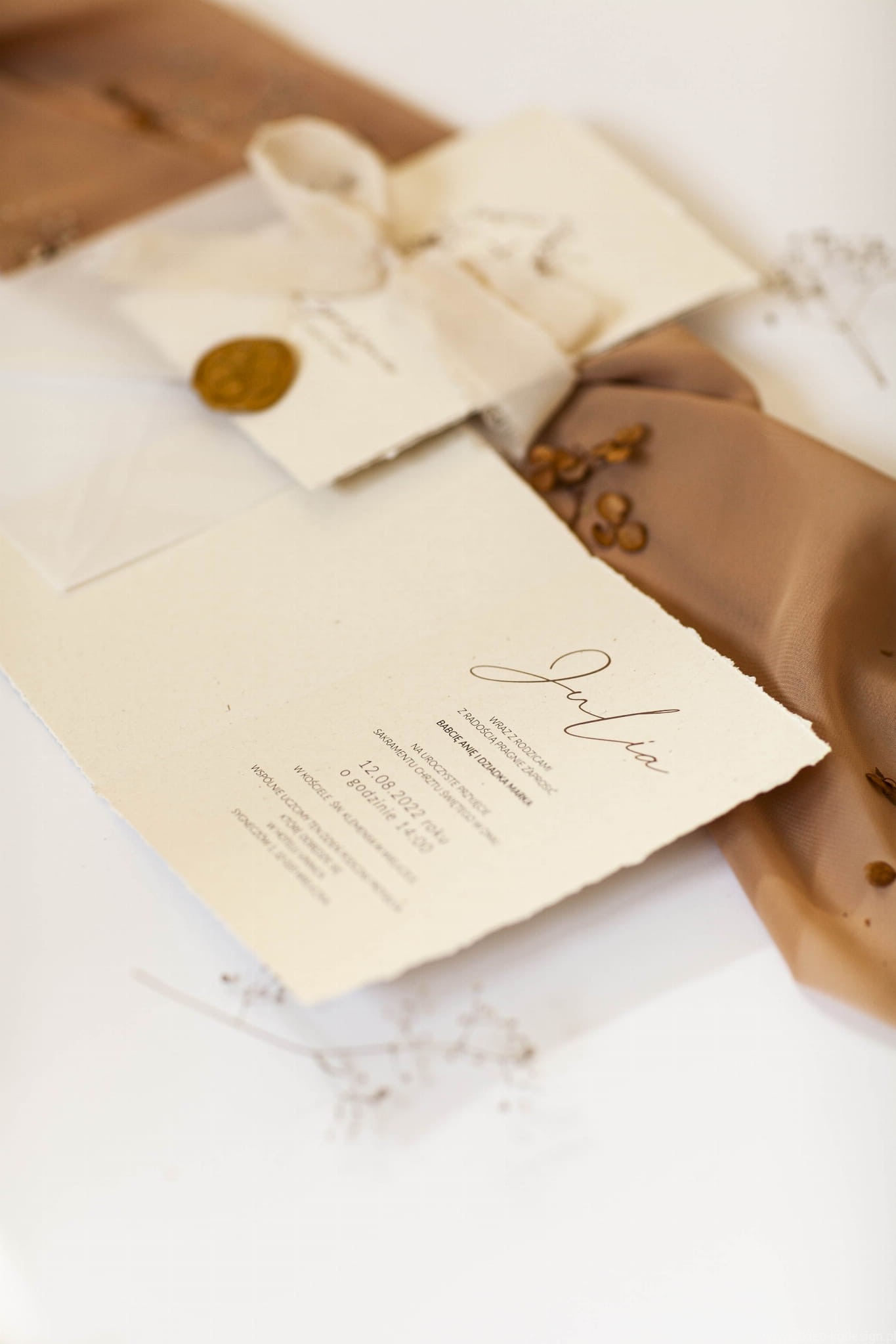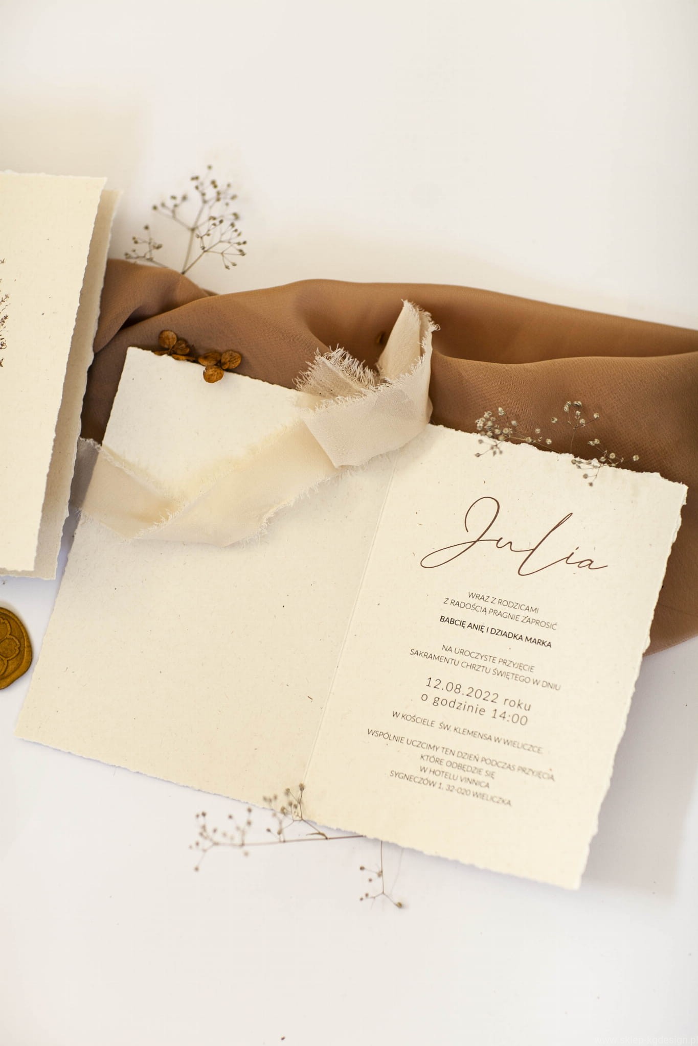 Zaproszenie na chrzest święty w stylu boho z rwanymi bokami i delikatną grafiką. Drukowane na papierze kremowym, ekologicznym z wtrąceniami. Do kompletu na zdjęciach wstążka szyfonowa rwana w kolorze jasnego beżu oraz transparentna koperta.