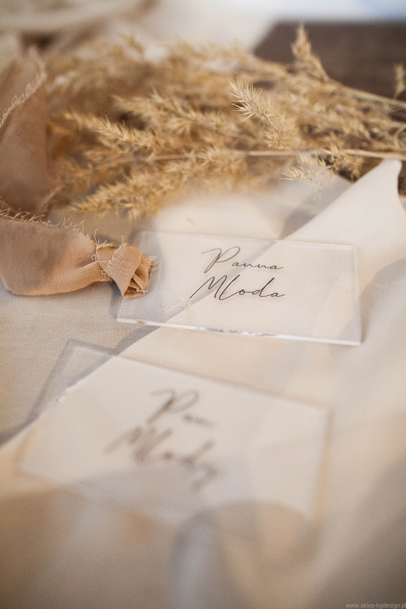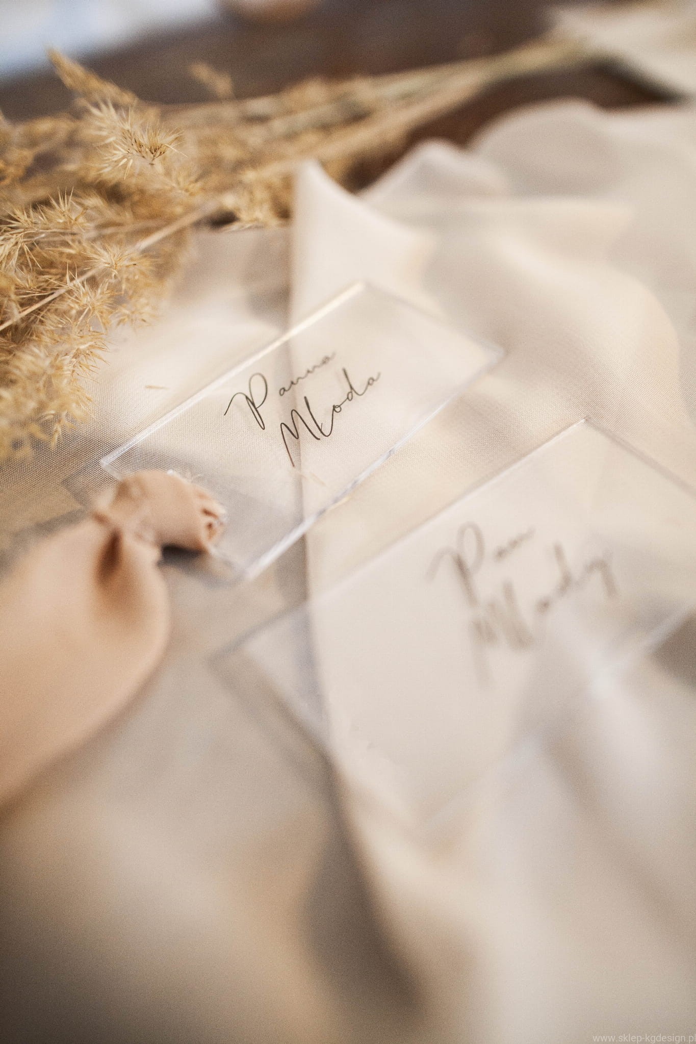 Winietka leżąca w stylu BOHO, z kaligraficzną czcionką drukowana na szkle akrylowym (pleksi). Delikatna i transparentna.