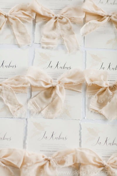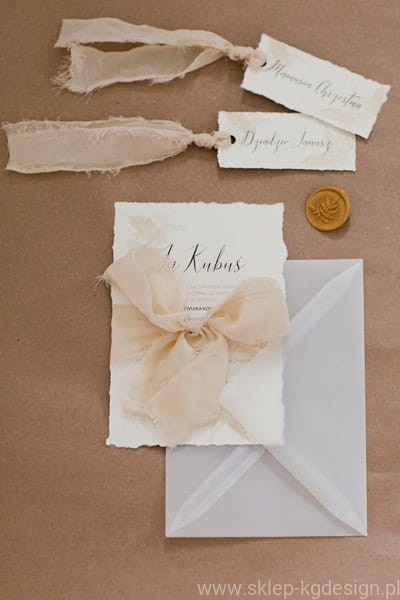 Zaproszenia są drukowane na papierze kremowym, ekologicznym z wtrąceniami. Dodatkowo lekkości dodaje materiałowa wstążka oraz transparentna koperta.