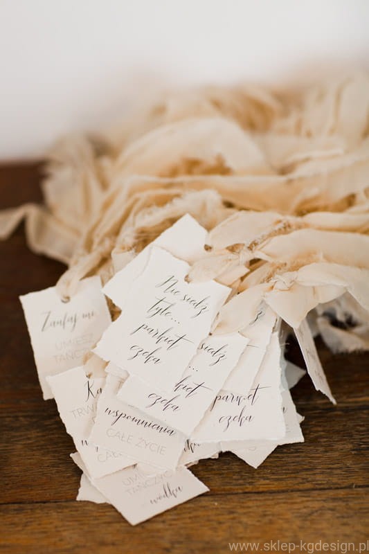 Zawieszka na alkohol z kaligraficzną czcionką drukowana na kremowym, eco, targanym papierze z wtrąceniami.